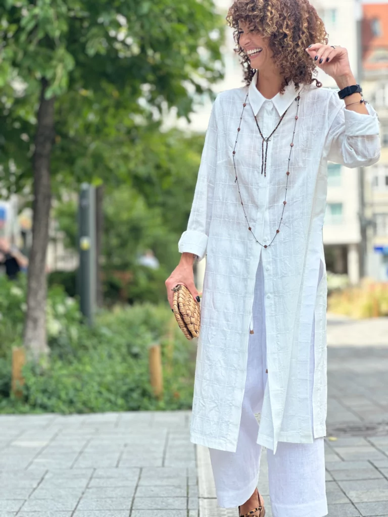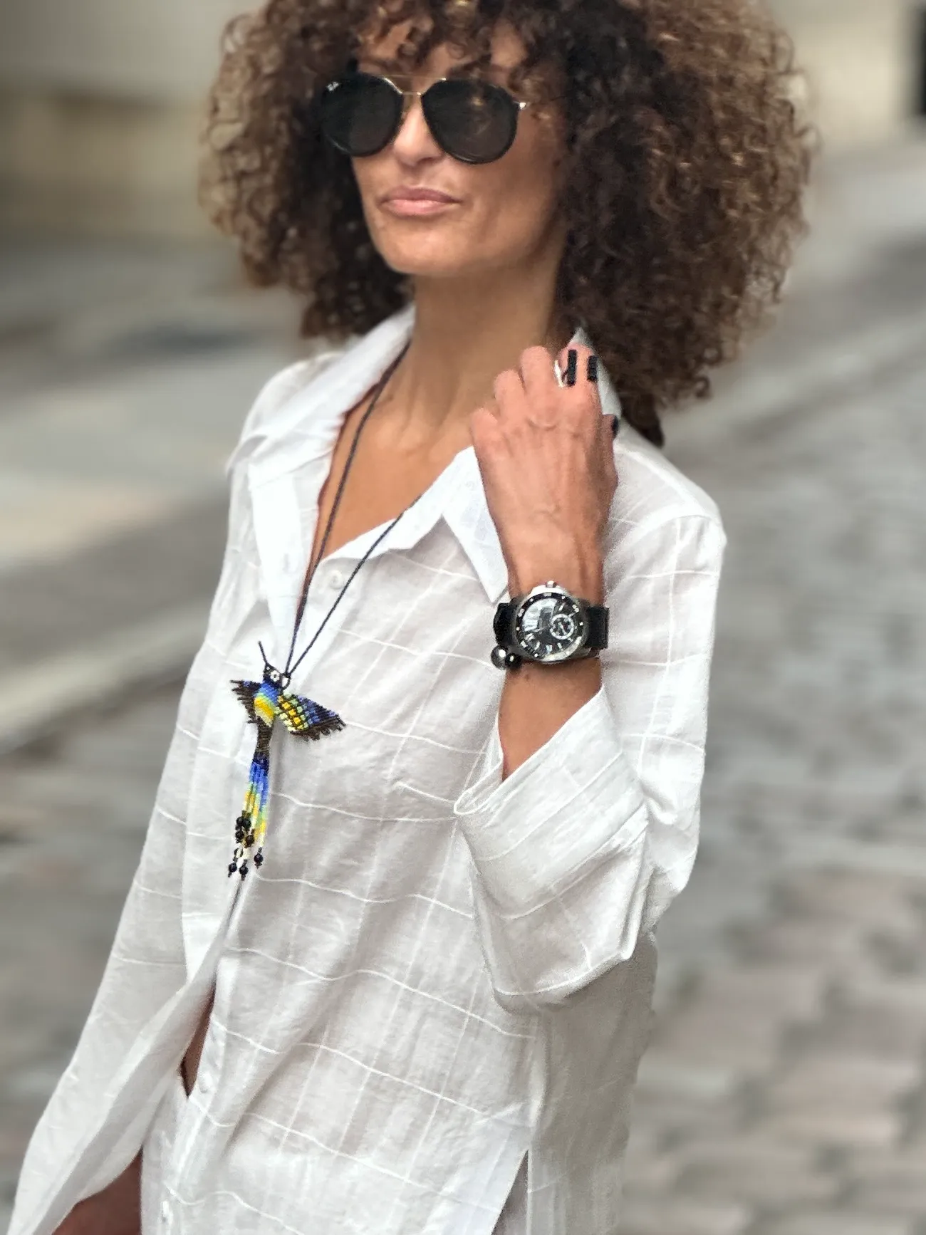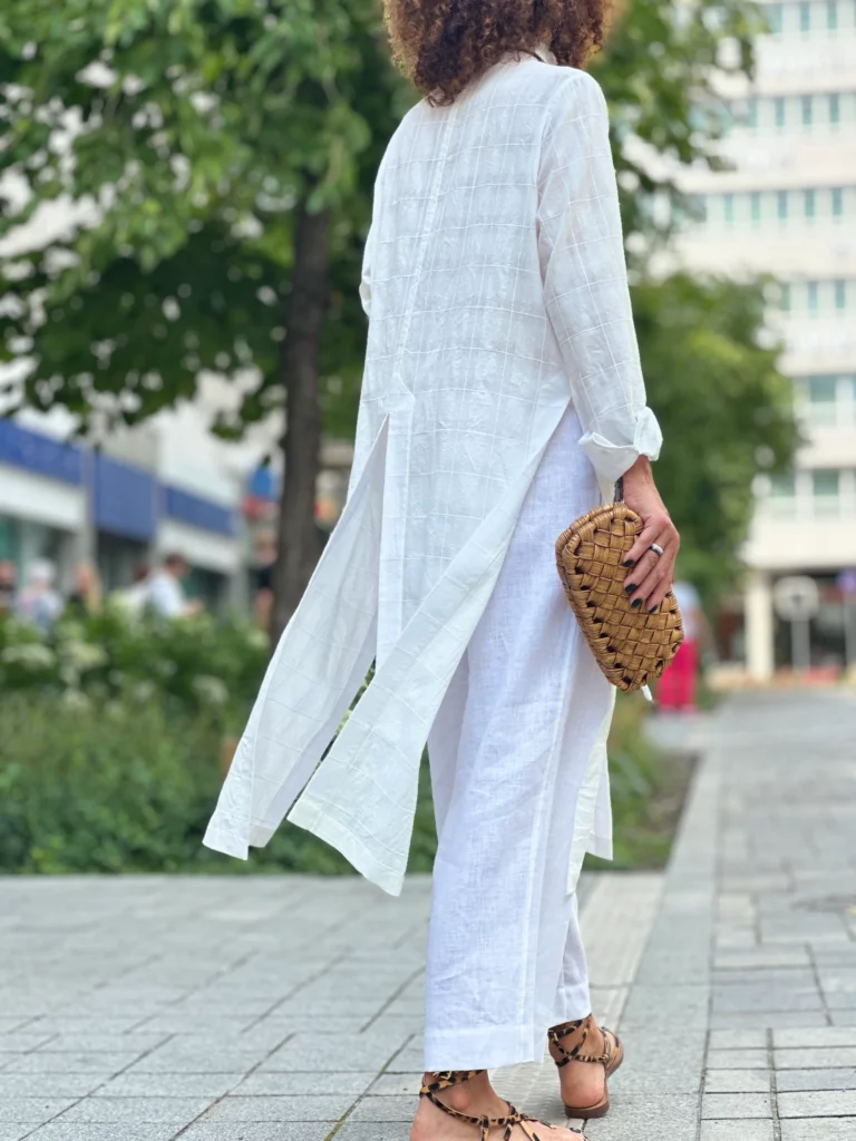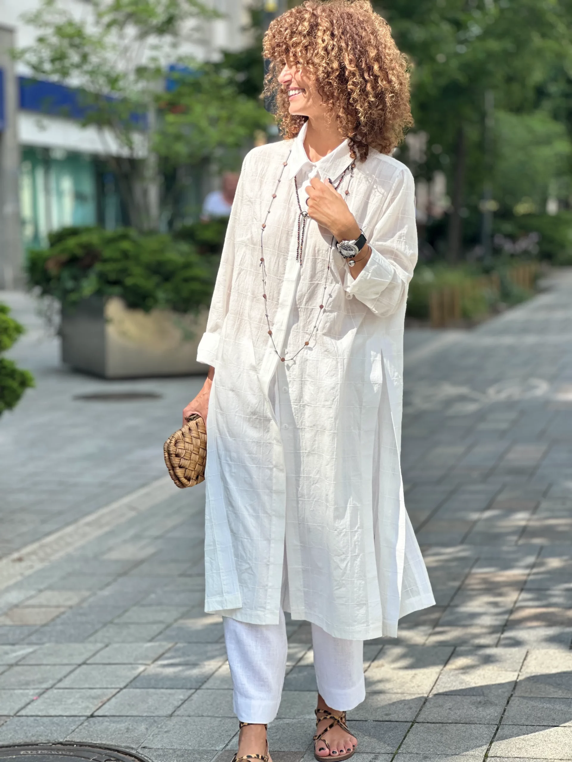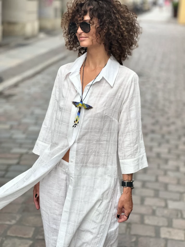 Auf den Fotos präsentieren wir die Größe S/M (mit Kolibri) und M/L (mit breiteren Hosen).