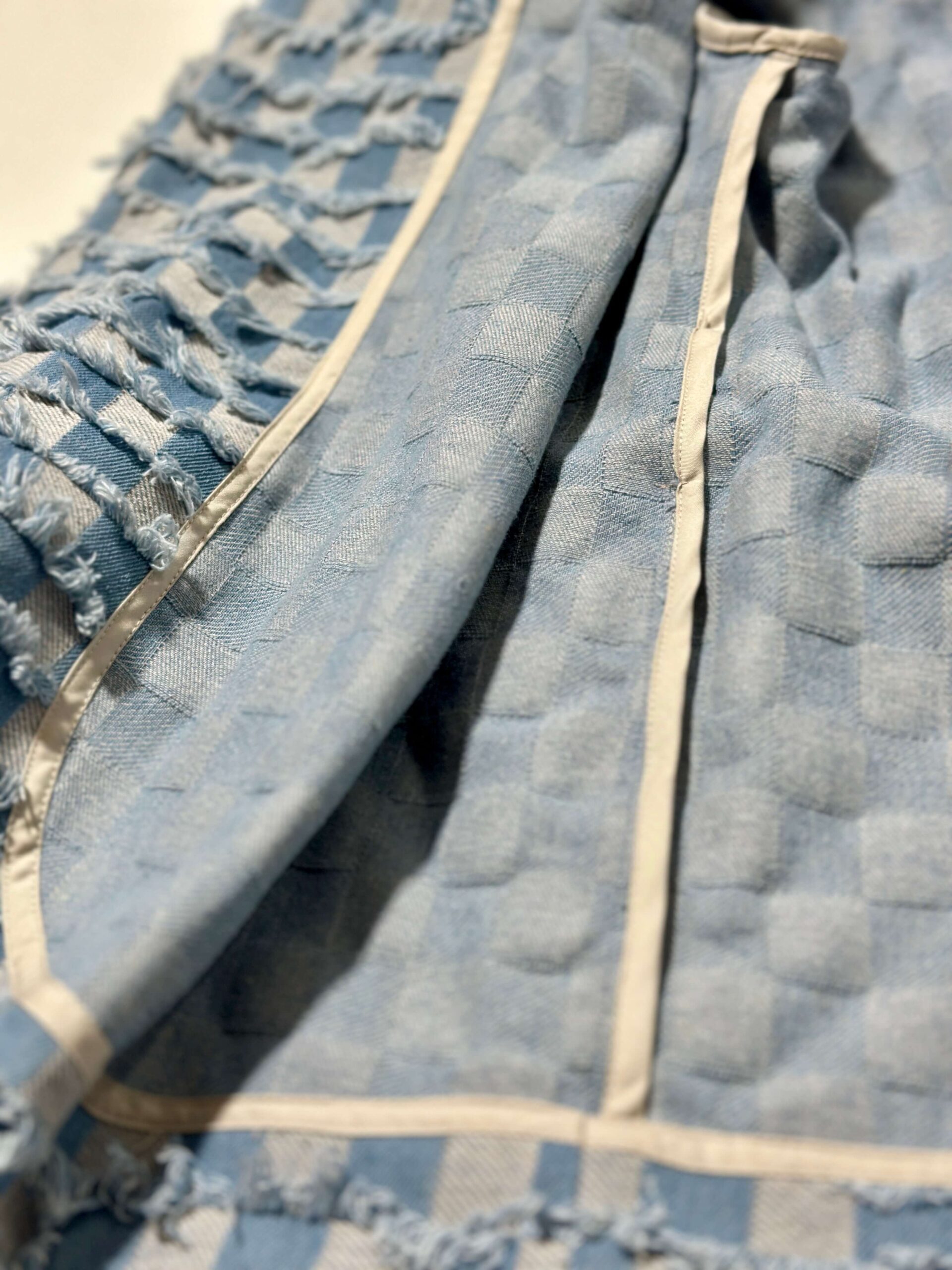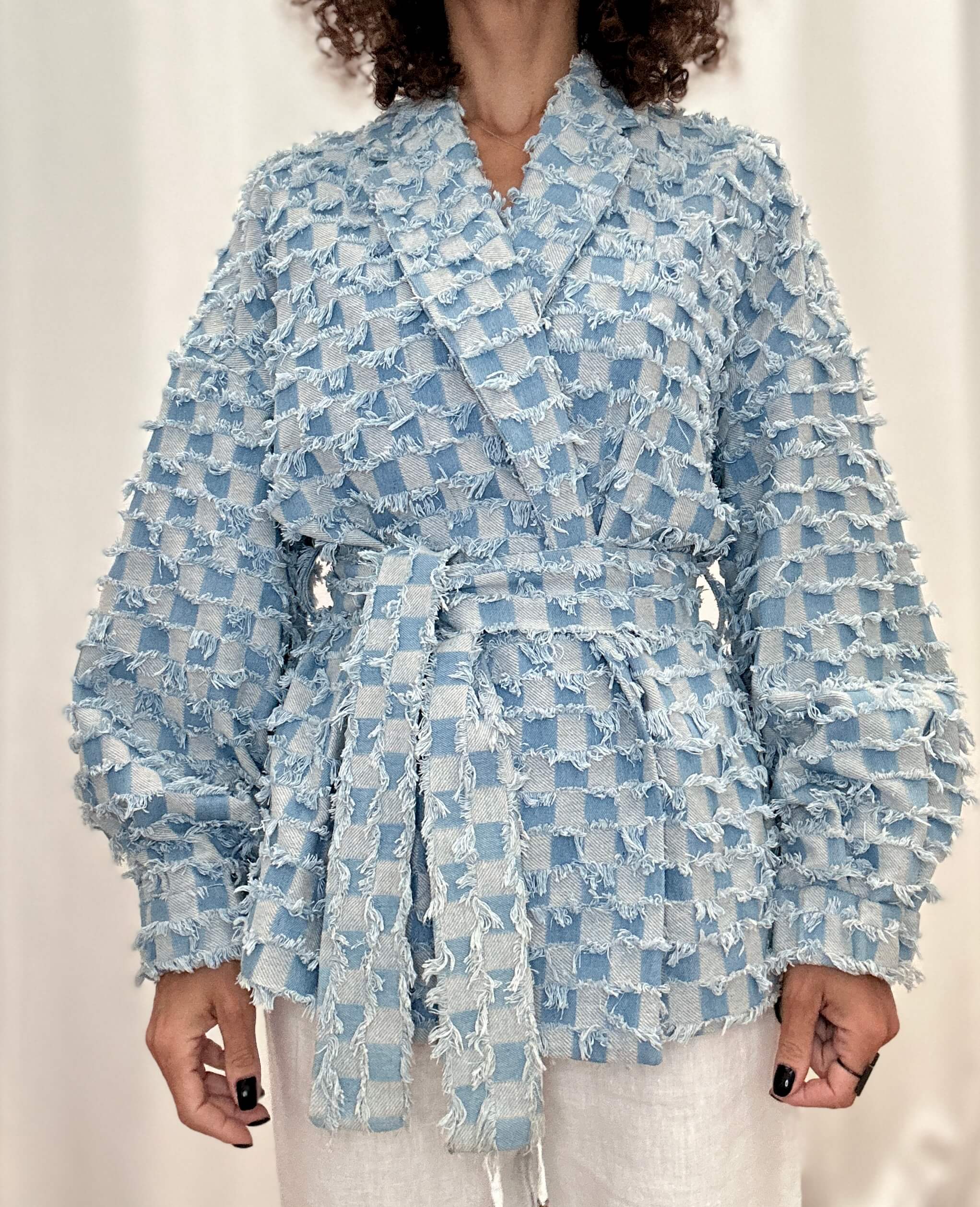 Jacke mit Gürtel im Set ohne Verschluss, Jeans 100% Baumwolle mit Fransen im Karomuster