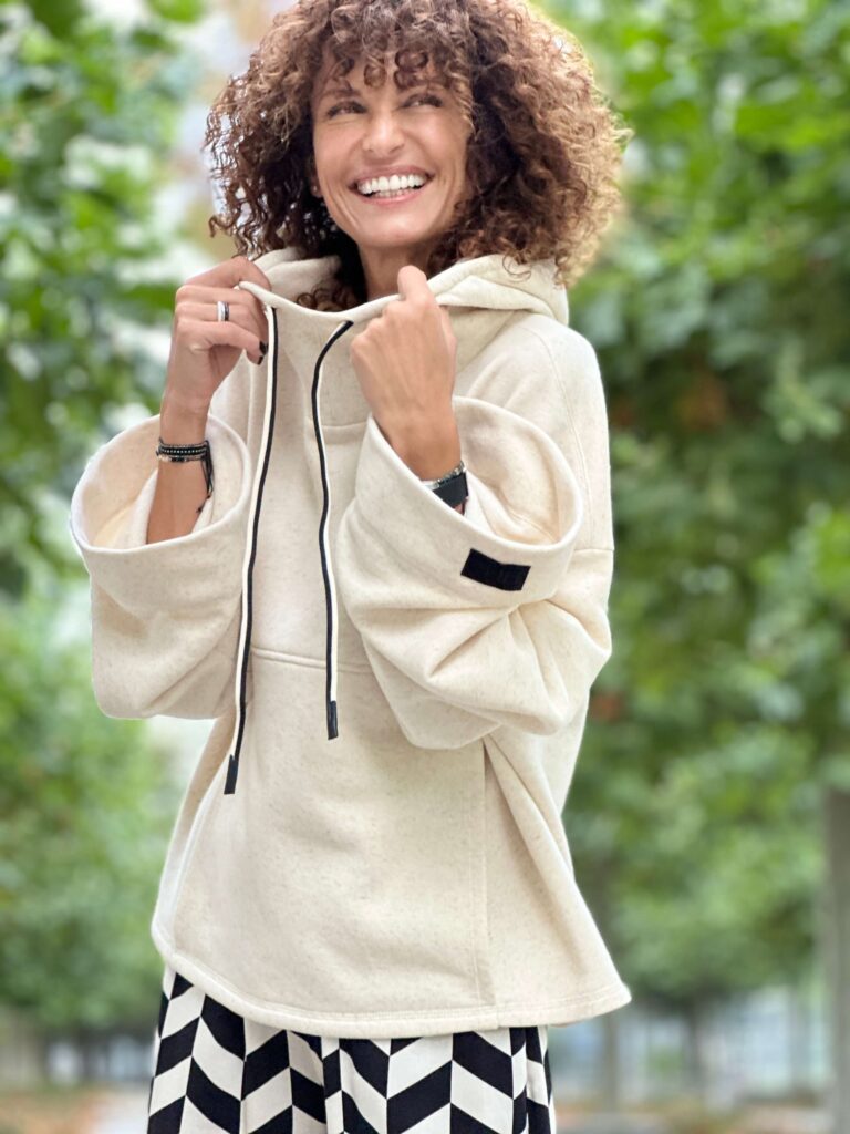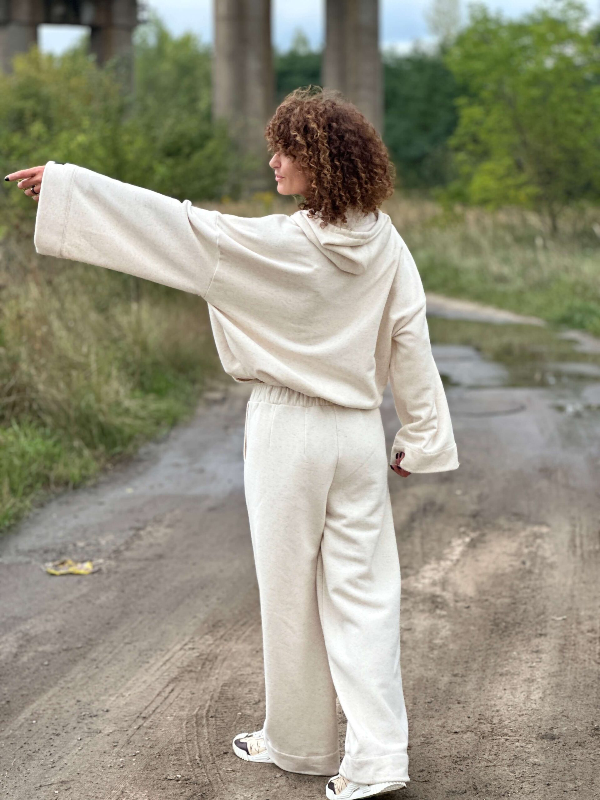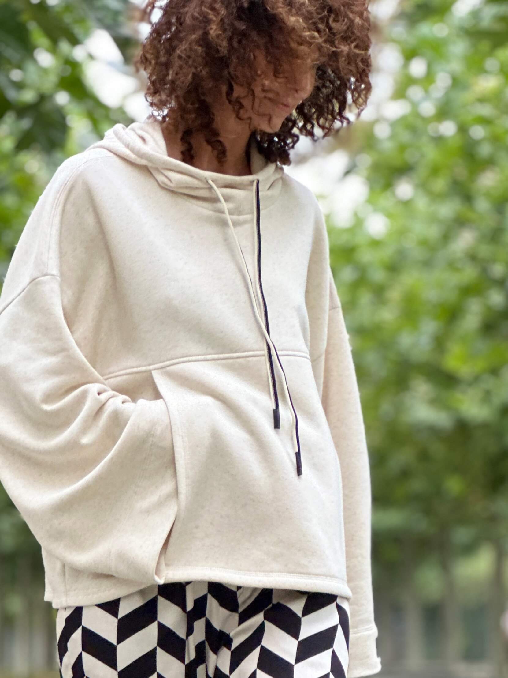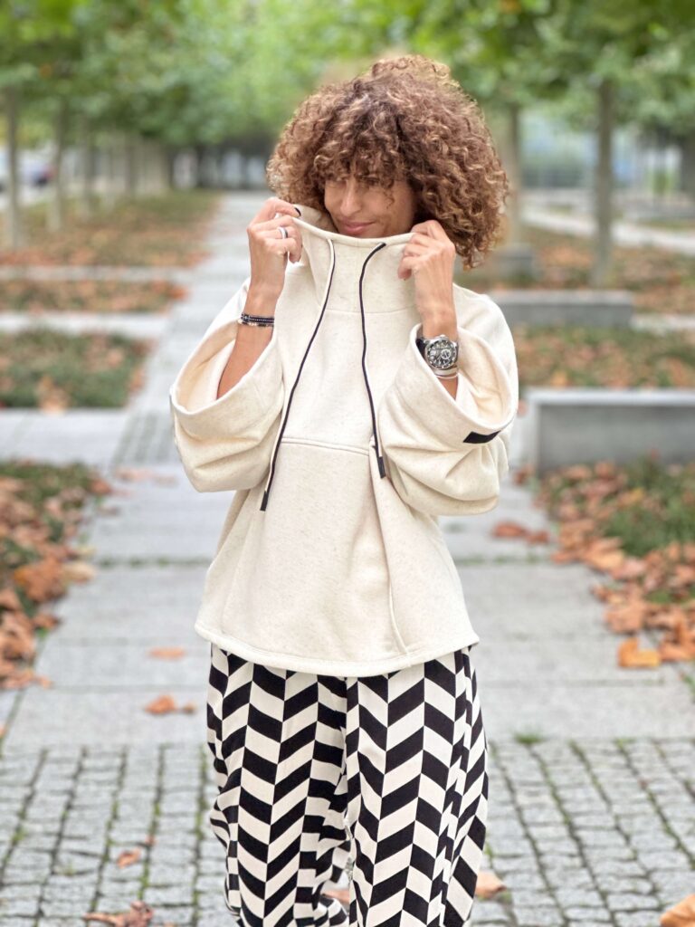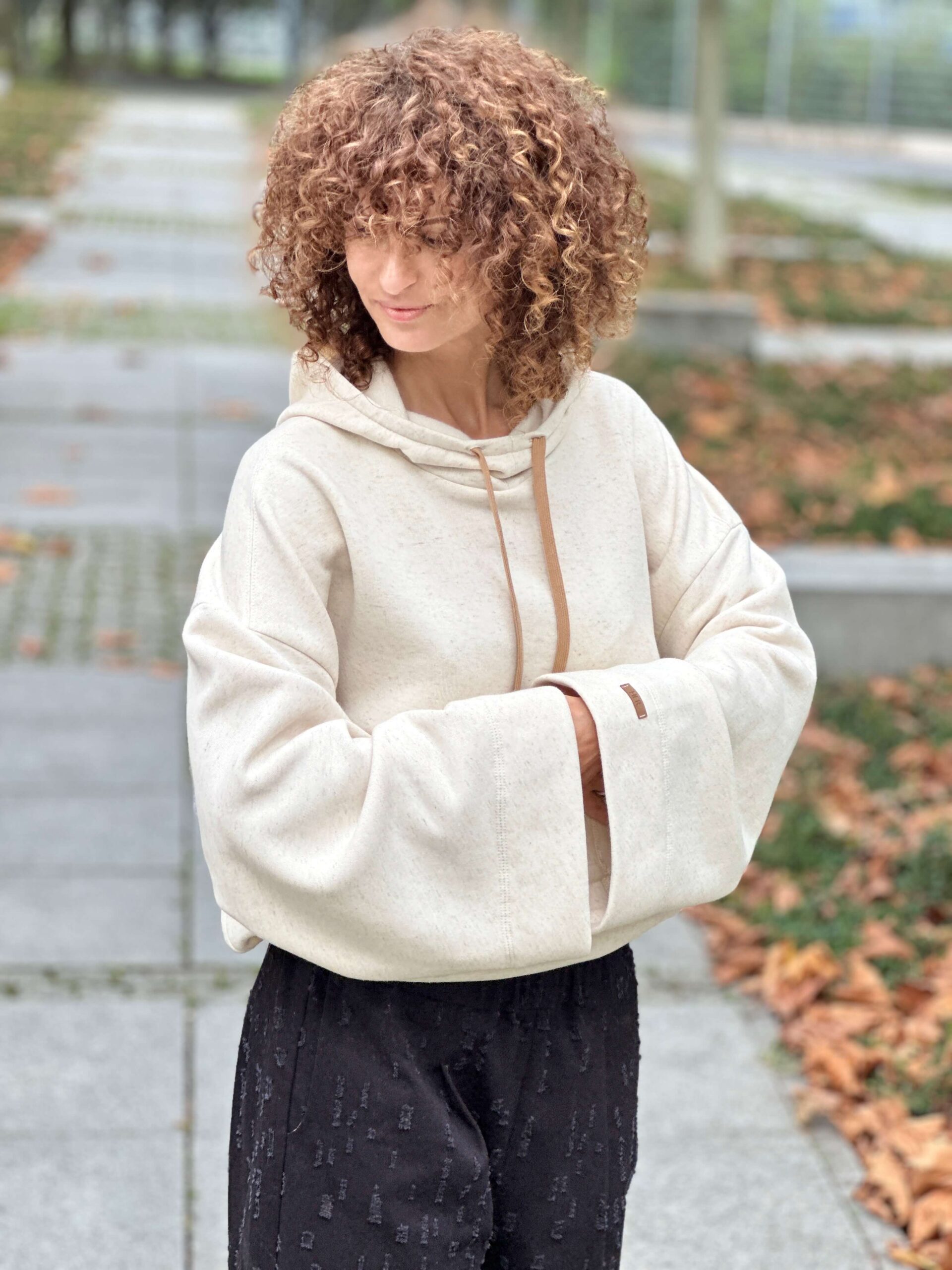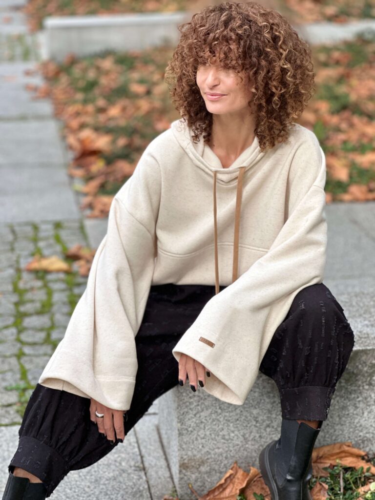 Wir lieben Kimonos und übertragen diesen Stil auf Trainingsanzüge. Sweatshirt mit weiten Kimonoärmeln in Oversize-Version. Die Kombination aus Baumwolle und Hanf sorgt für einen interessanten Melange-Effekt und veredelt den Stoff. Wählen Sie die Farbe der Verzierung und die Version des Saums: elastisch oder gerade.