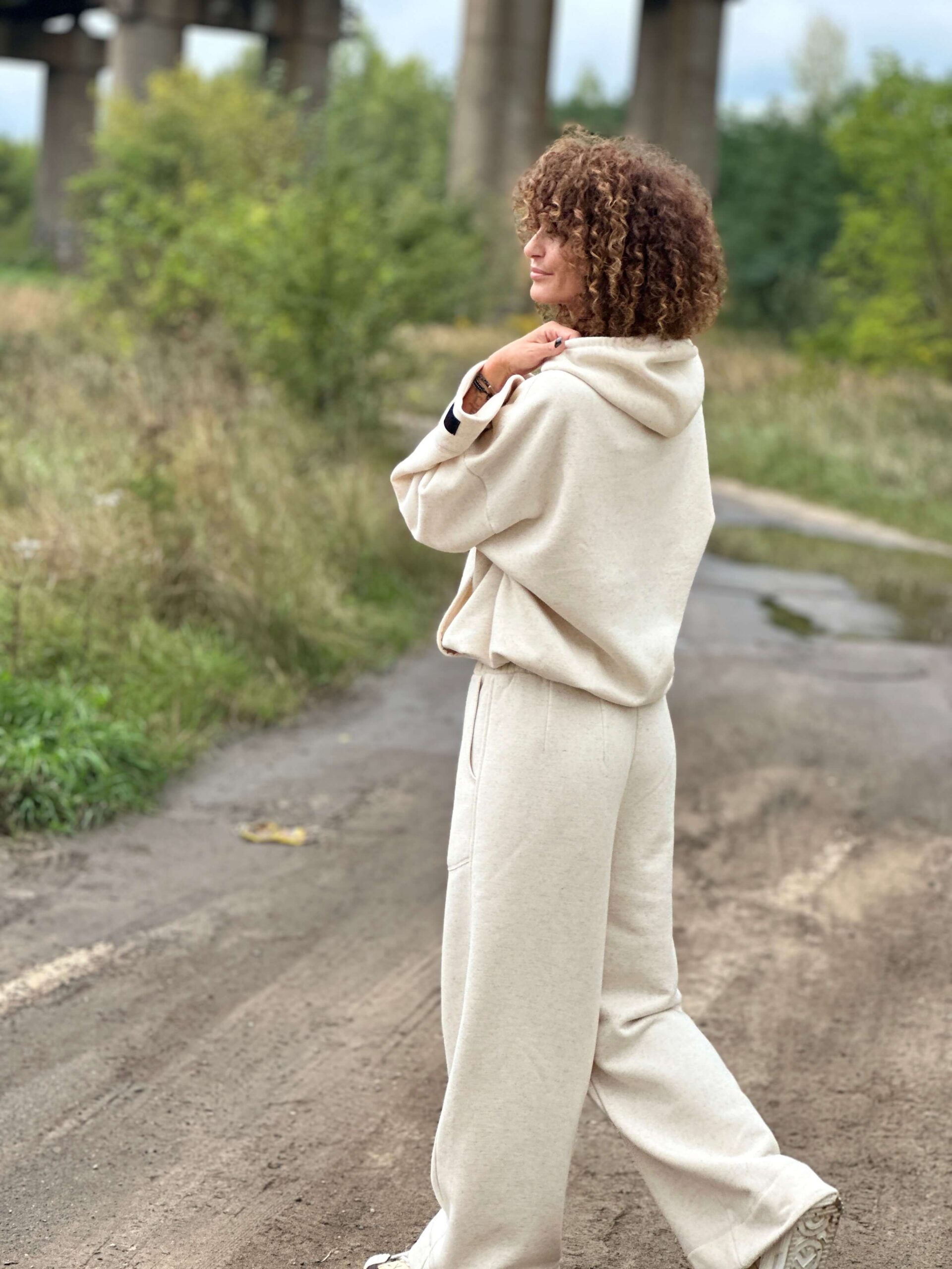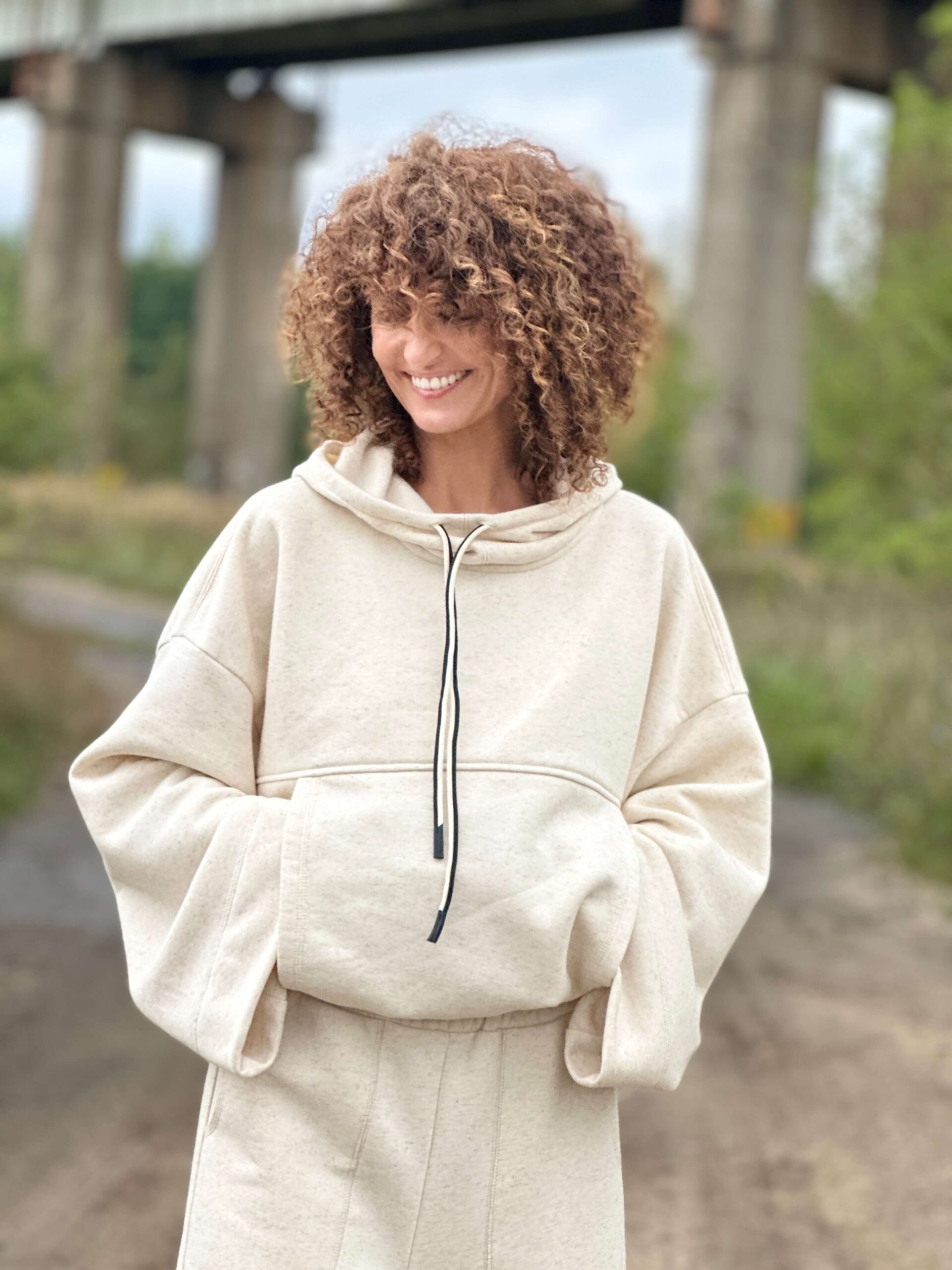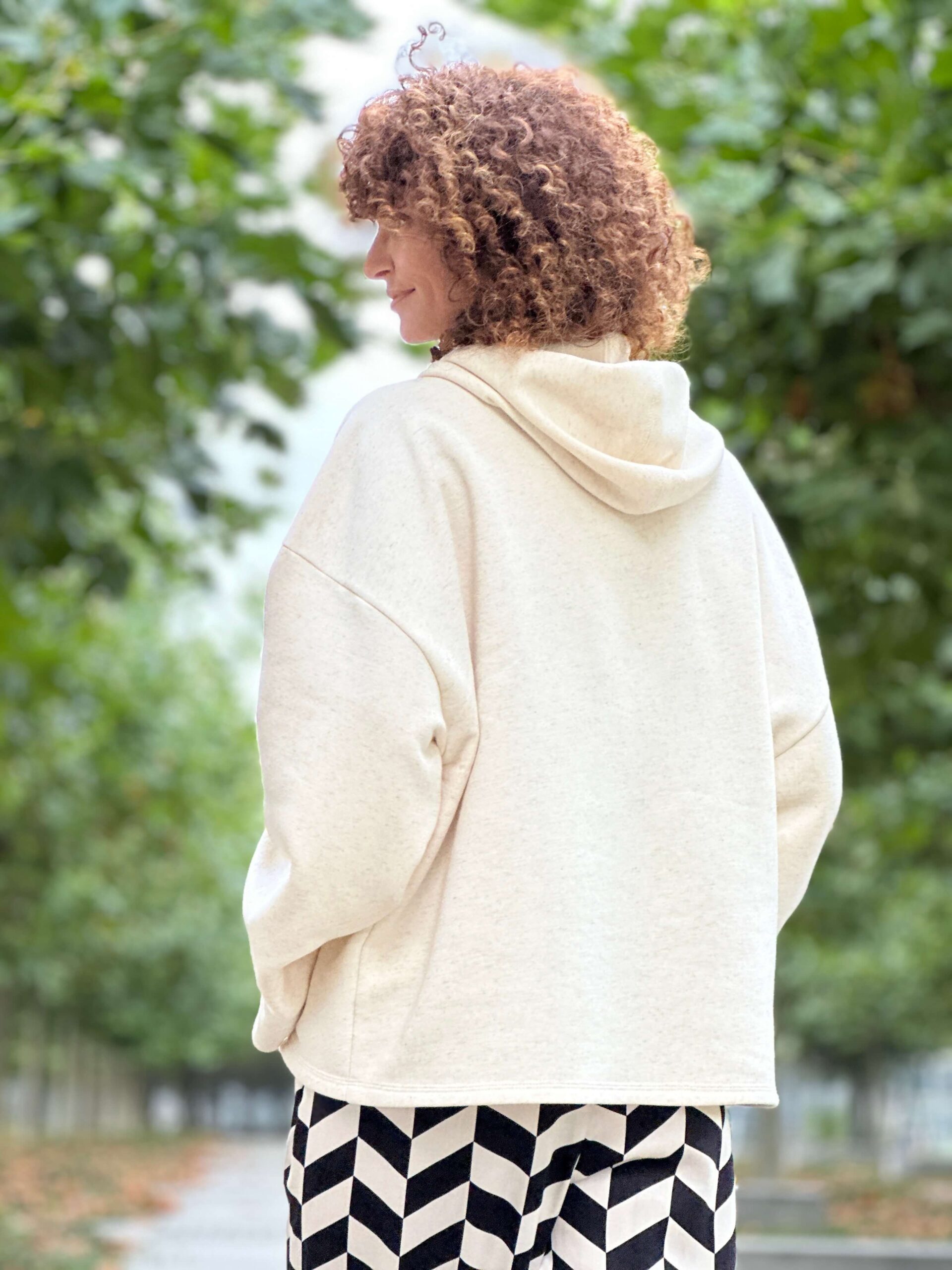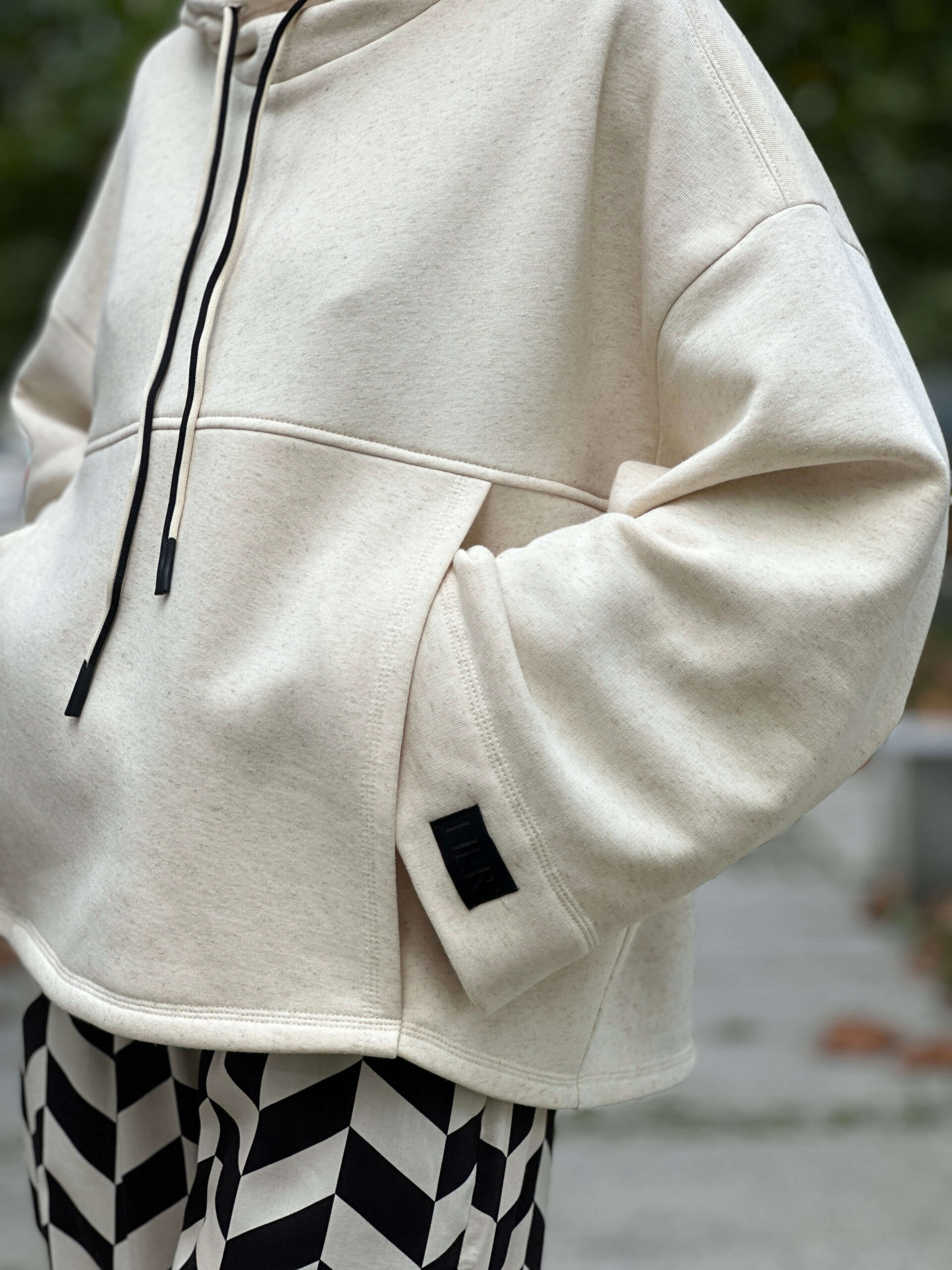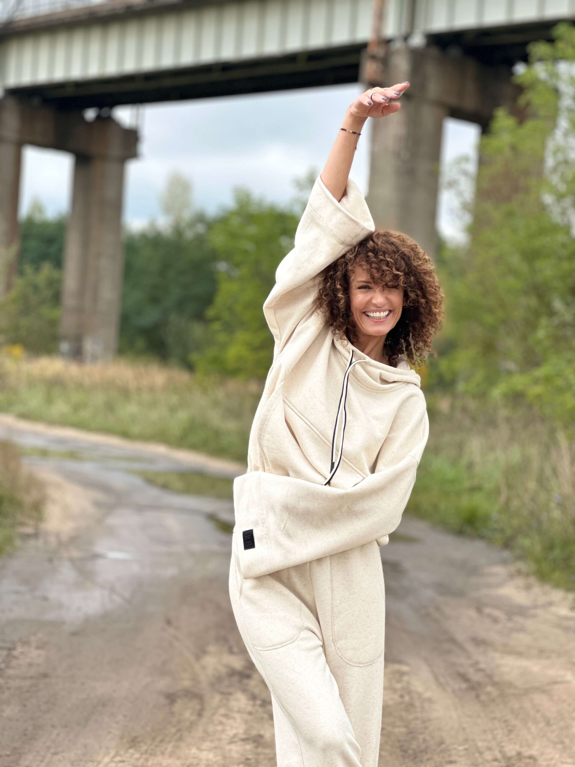 Wir lieben Kimonos und übertragen diesen Stil auf Trainingsanzüge. Sweatshirt mit weiten Kimonoärmeln in Oversize-Version. Die Kombination aus Baumwolle und Hanf sorgt für einen interessanten Melange-Effekt und veredelt den Stoff. Wählen Sie die Farbe der Verzierung und die Version des Saums: elastisch oder gerade.
