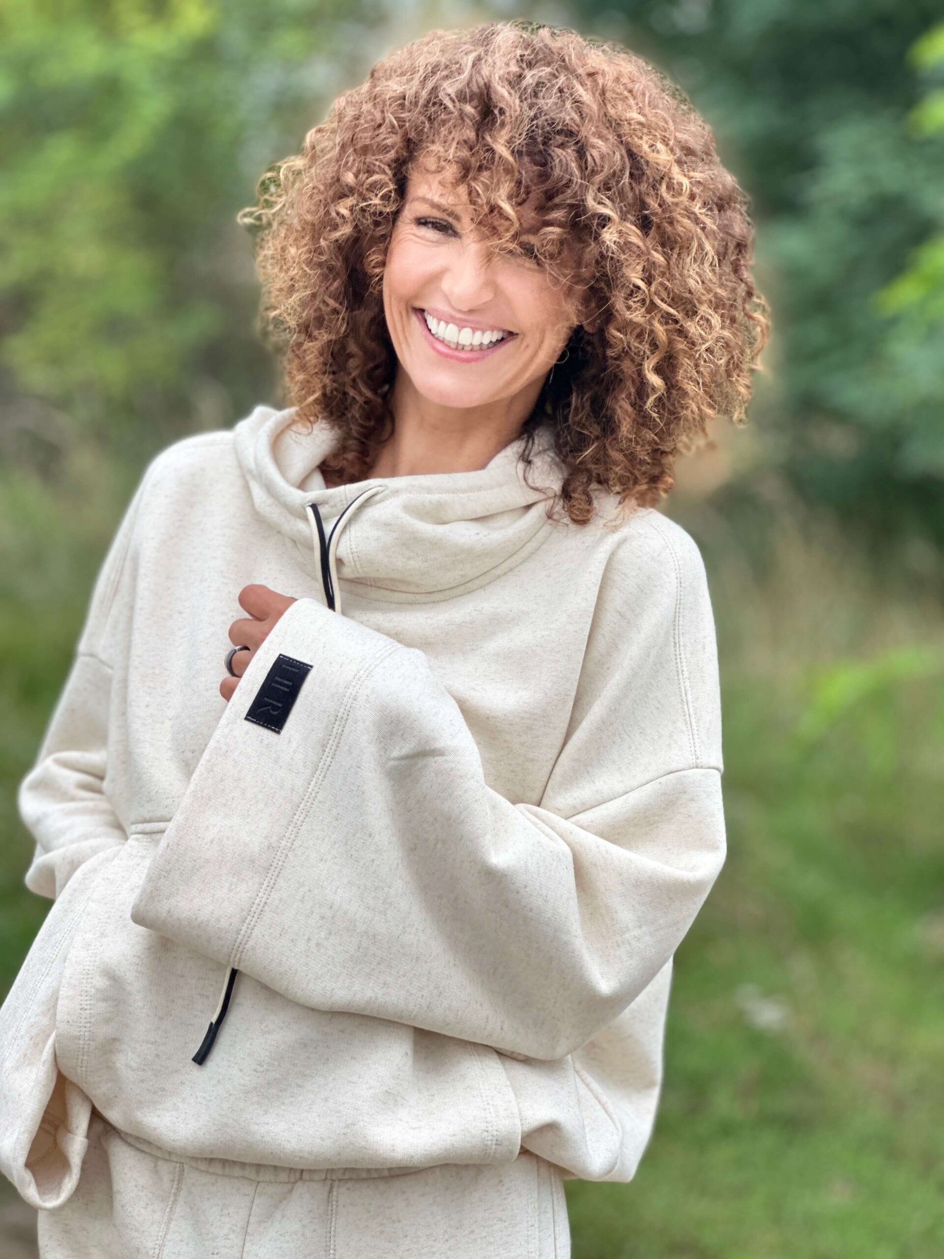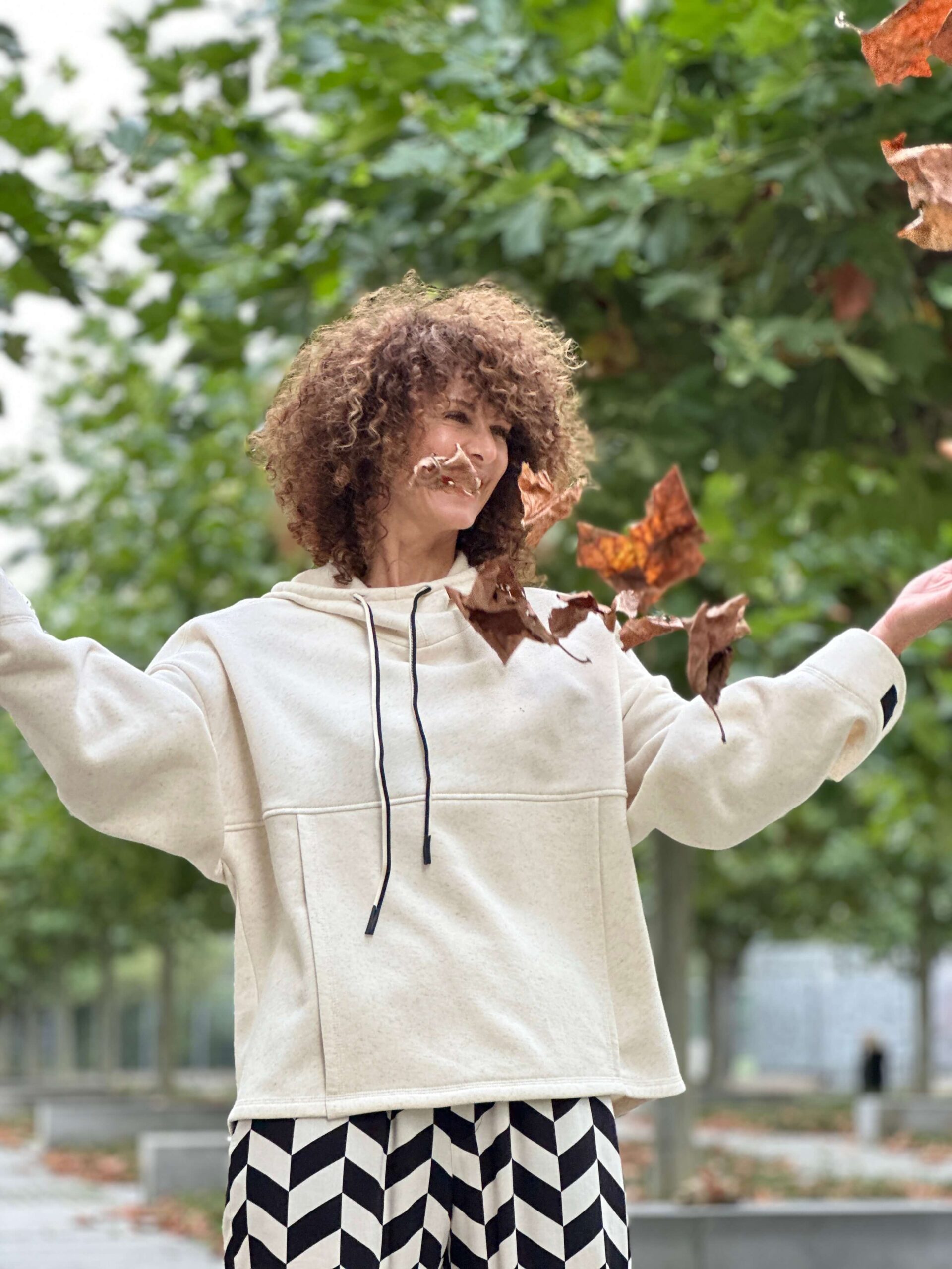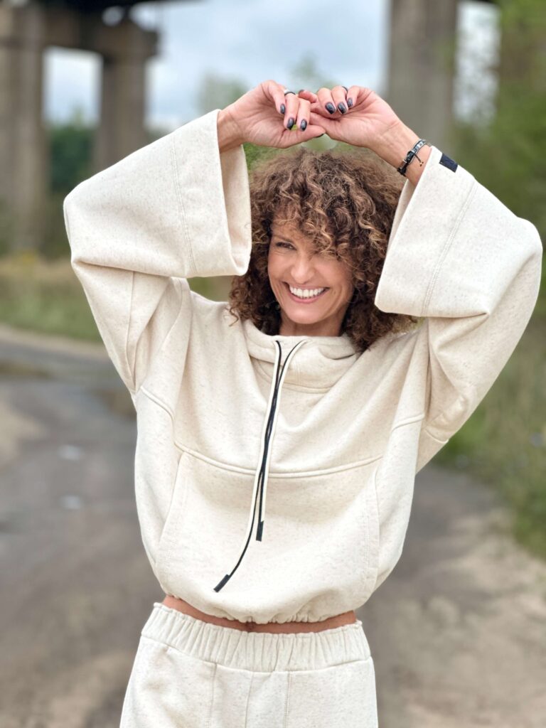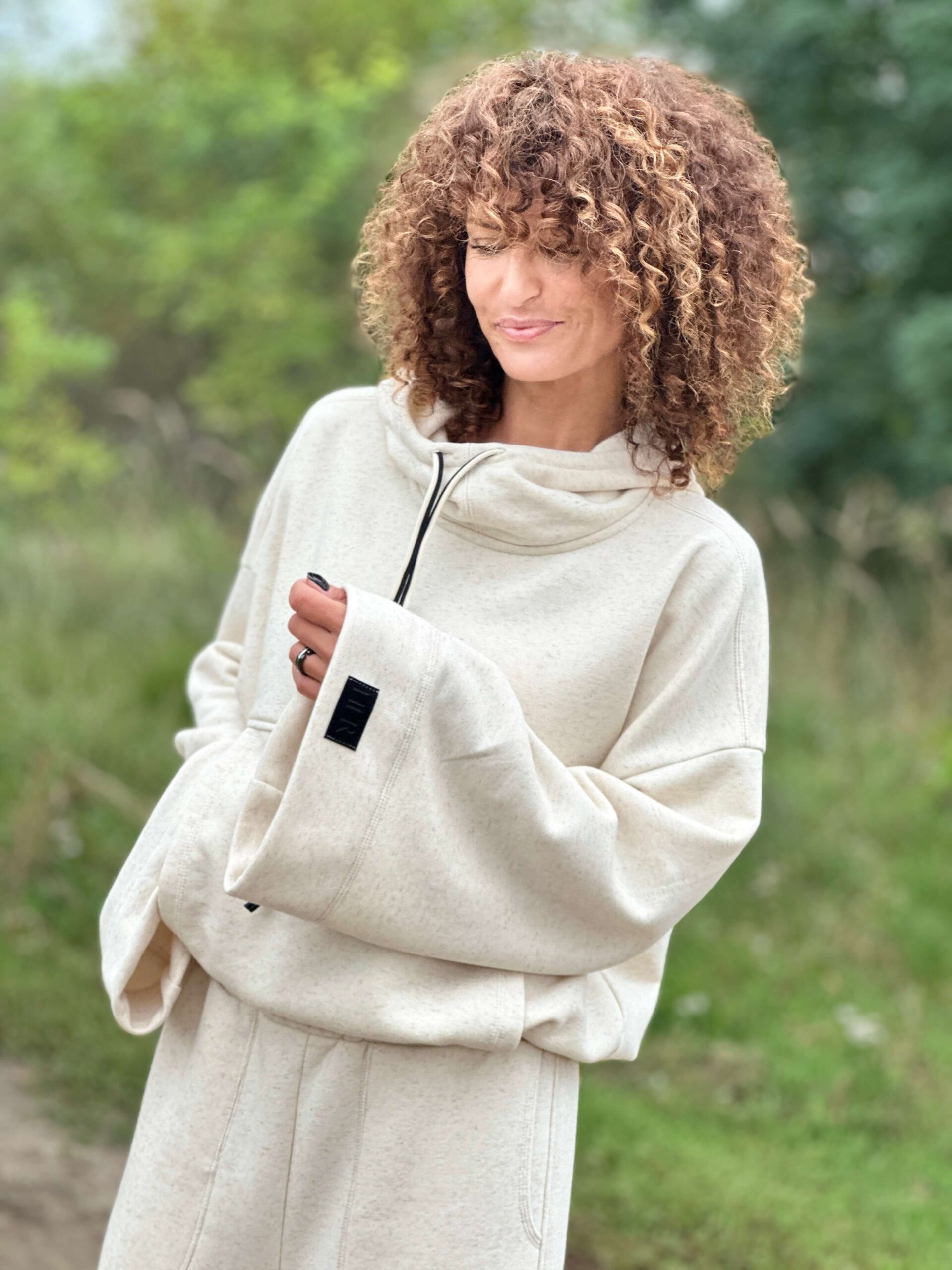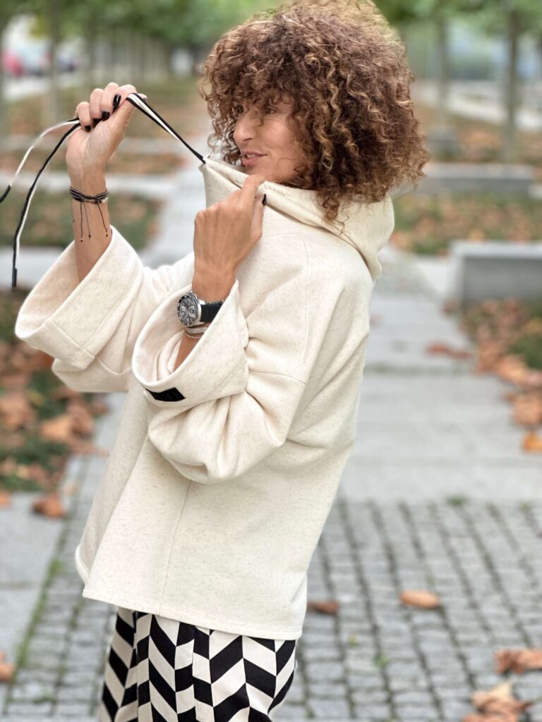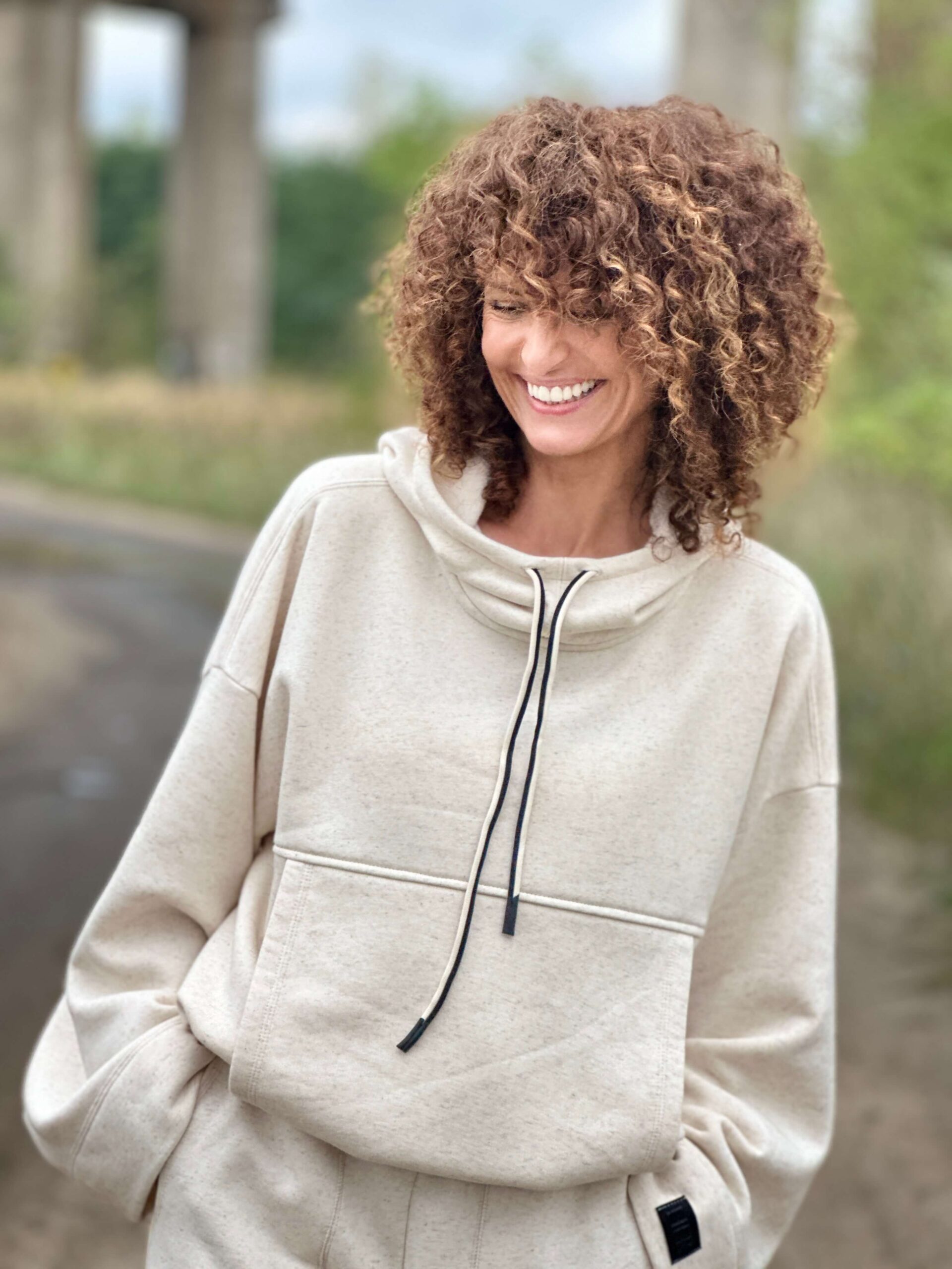 Wir lieben Kimonos und übertragen diesen Stil auf Trainingsanzüge. Sweatshirt mit weiten Kimonoärmeln in Oversize-Version. Die Kombination aus Baumwolle und Hanf sorgt für einen interessanten Melange-Effekt und veredelt den Stoff. Wählen Sie die Farbe der Verzierung und die Version des Saums: elastisch oder gerade.