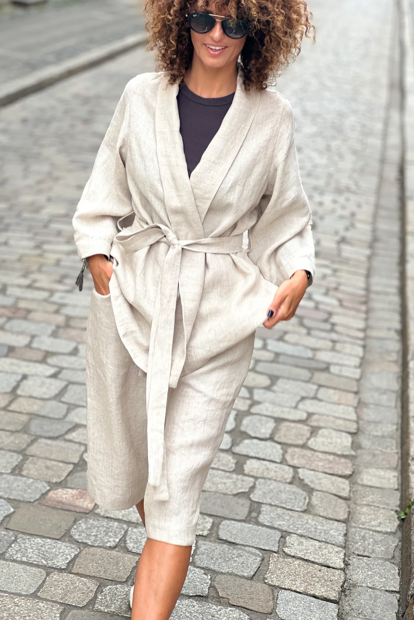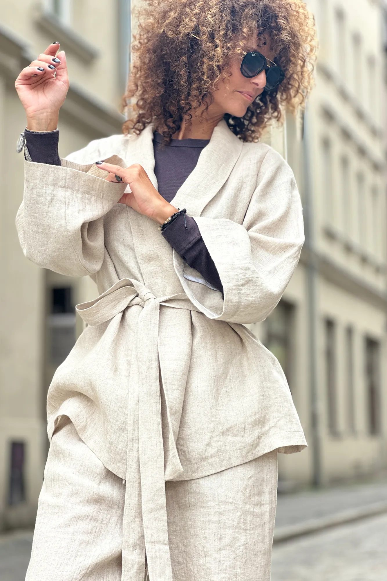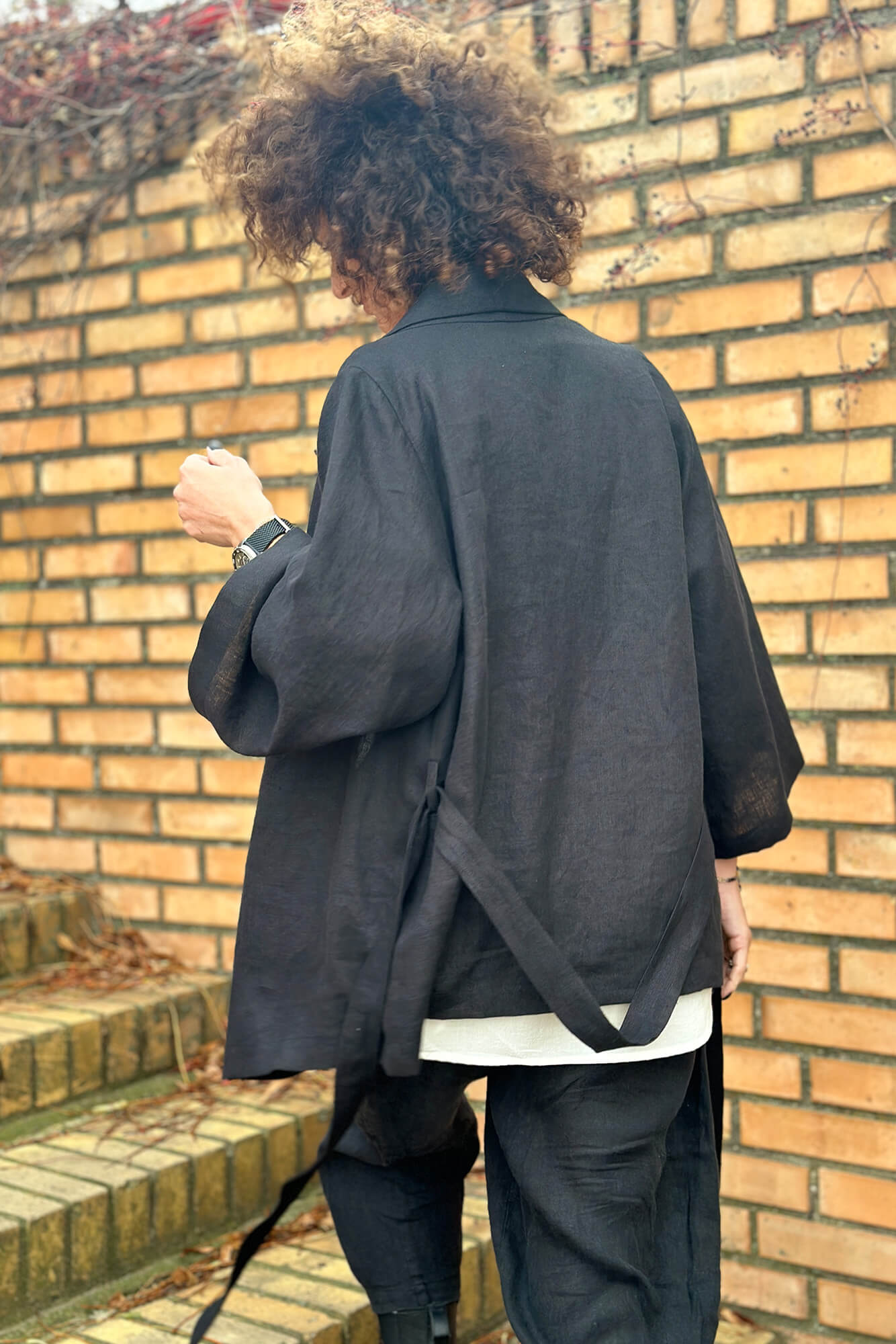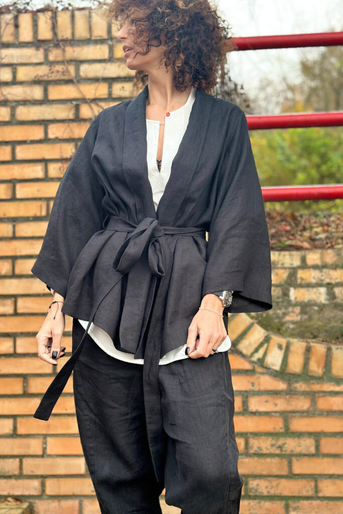 Die kürzere Version des Kimonos kann das ganze Jahr über getragen werden und ersetzt den klassischen Blazer oder Cardigan. Der Kimono in Hüftlänge hat weitere 7/8-Ärmel, einen langen Gürtel zum Binden in der Taille und einen schönen Schalsaum. Die kurzen Ärmel betonen die Silhouette und bilden nach dem Binden eine Baskenform. Innen mit Paspelierung.