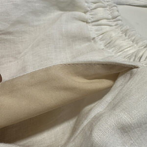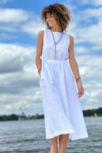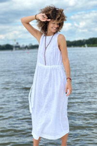 Das Foto zeigt die Größe S/M mit einer Länge von 125 cm – bei einer Körpergröße von 174 cm (weiß und beige).