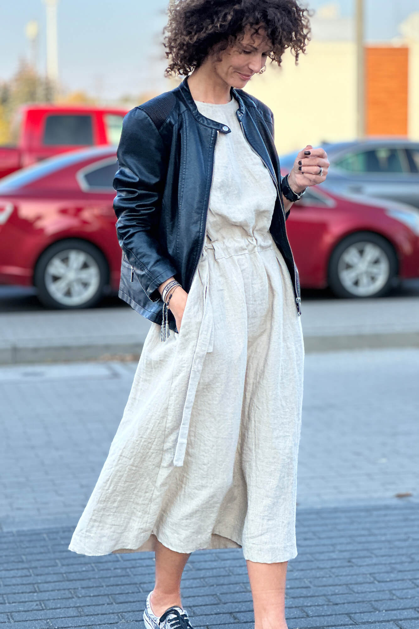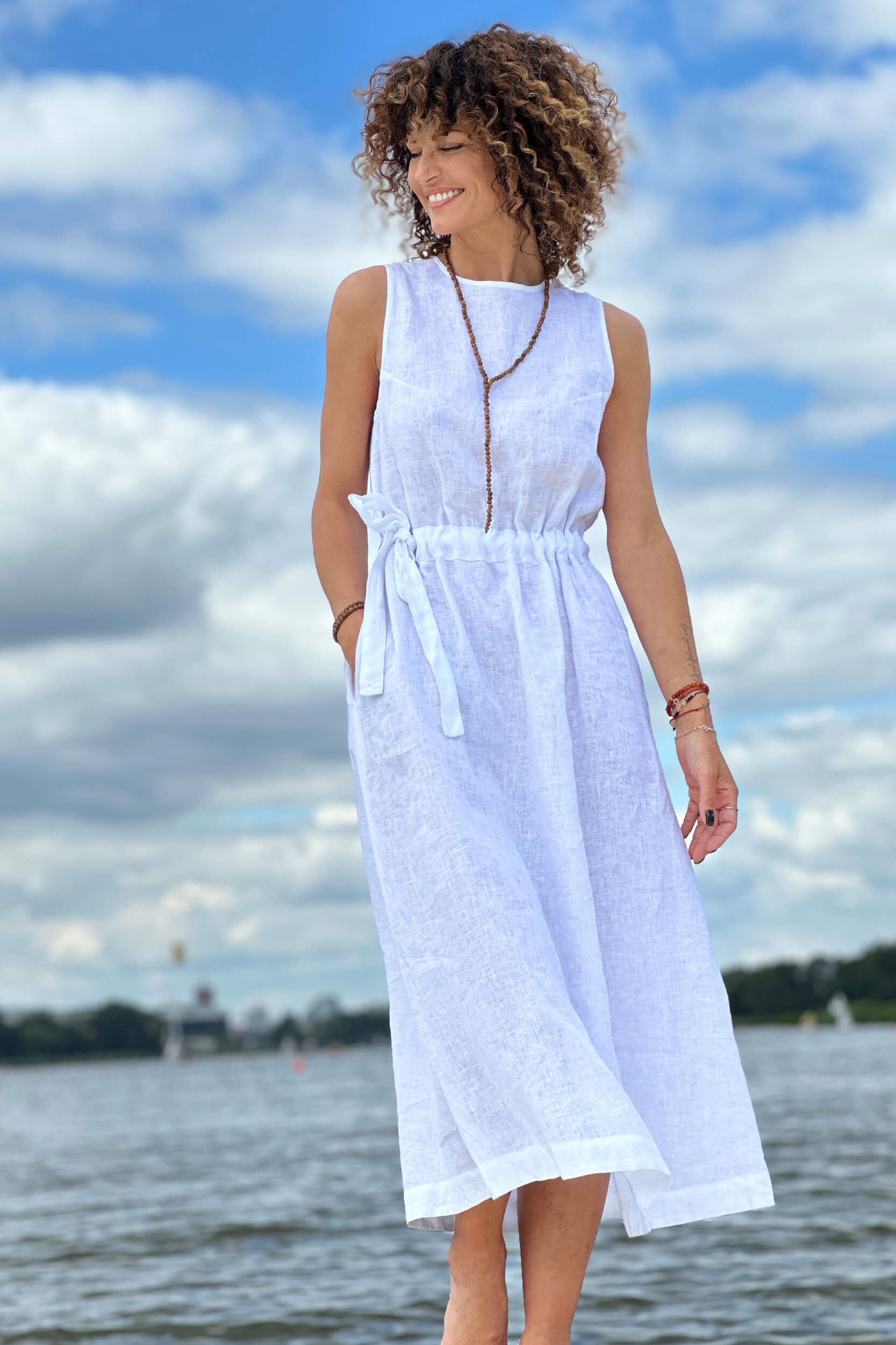 Das Foto zeigt die Größe S/M mit einer Länge von 125 cm – bei einer Körpergröße von 174 cm (weiß und beige).