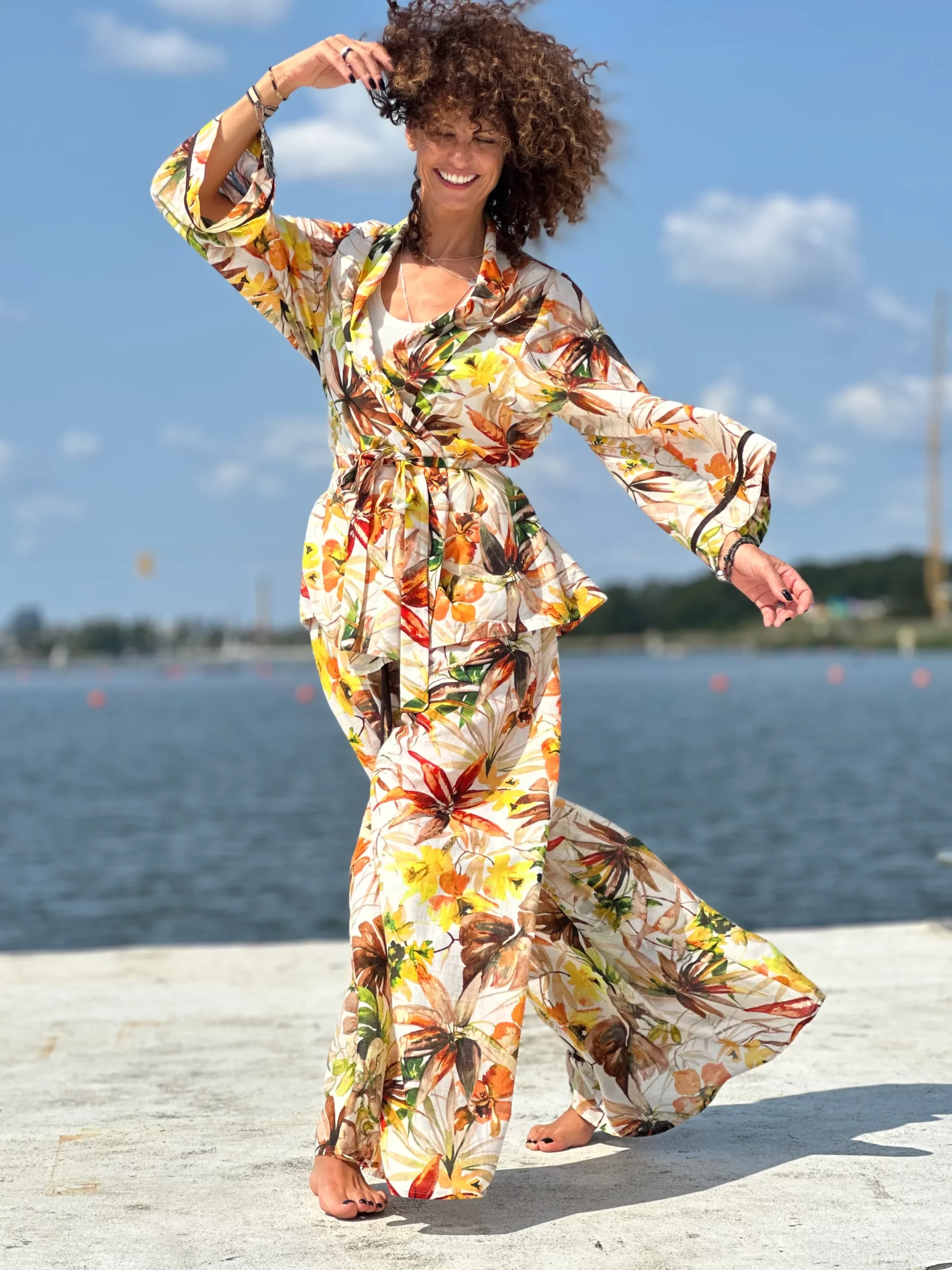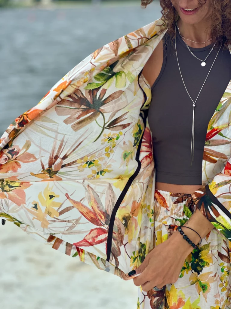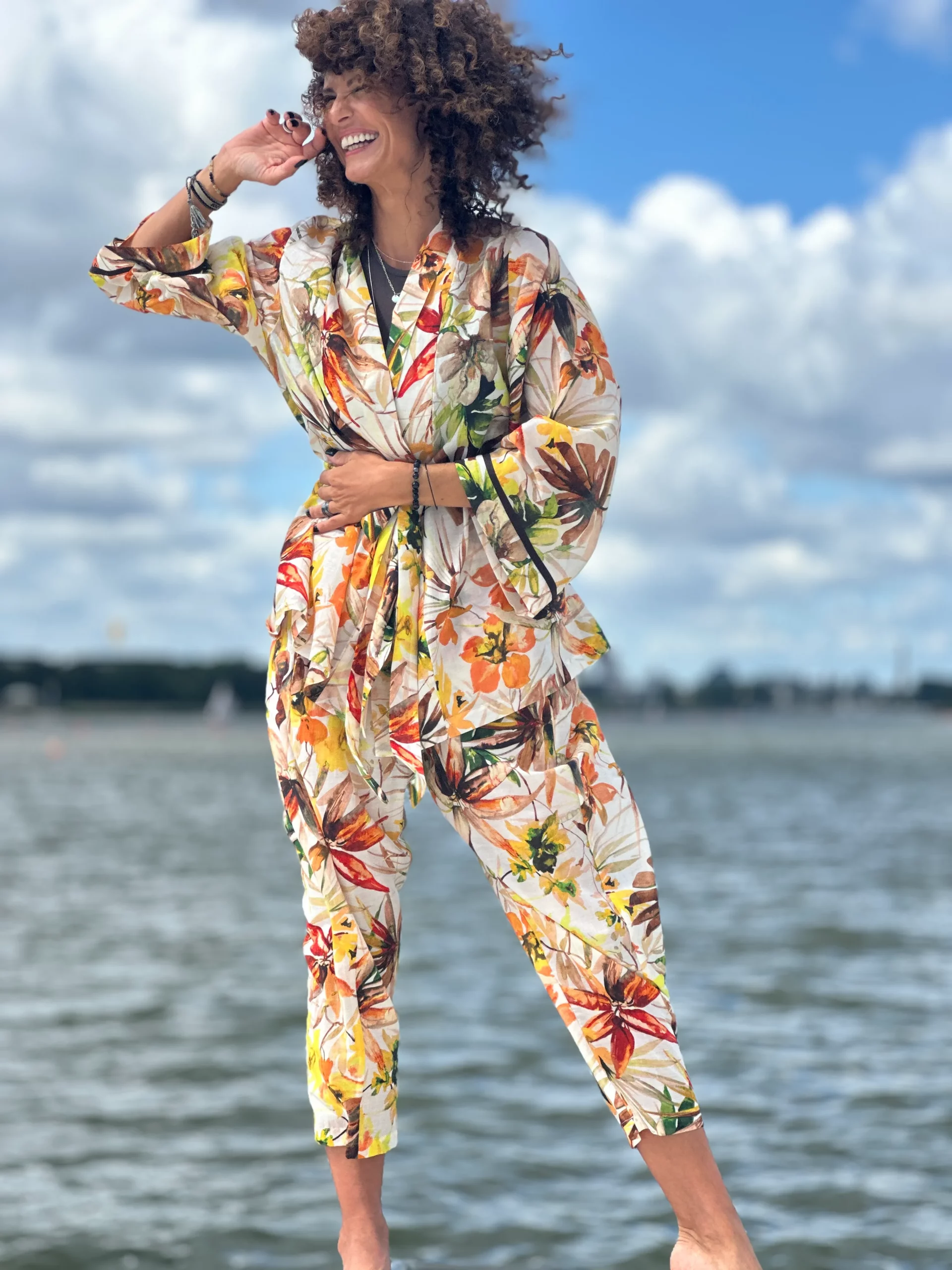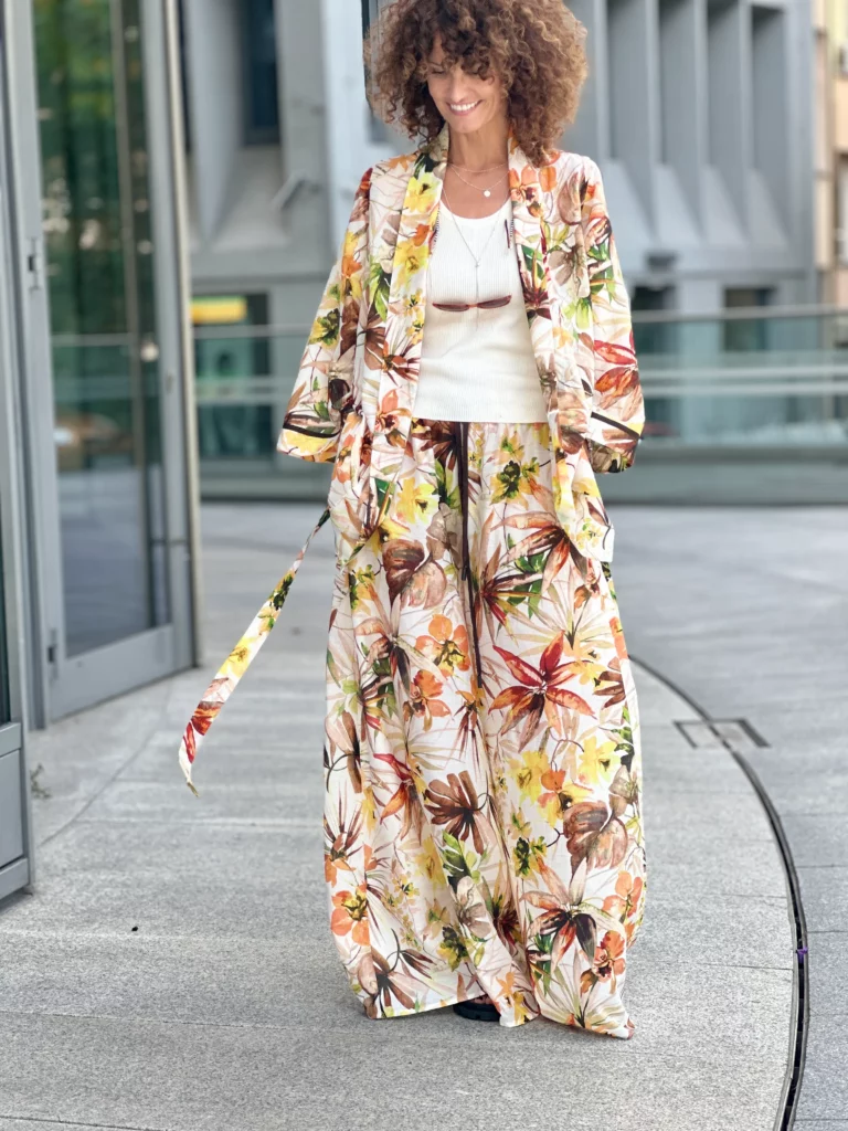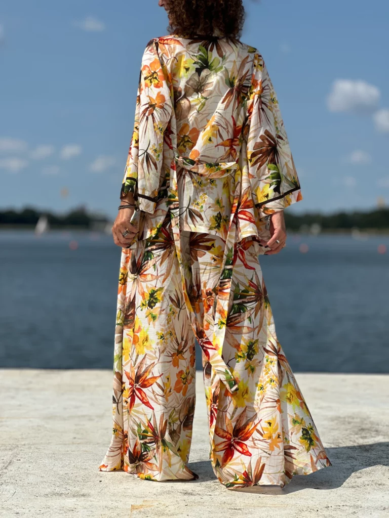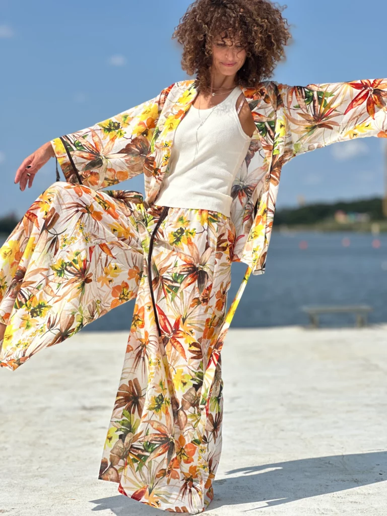 Ein Set, das so luftig ist, dass es schwer zu beschreiben ist – man muss es anziehen und anfassen. Die Kombination aus Batistbaumwolle und Seide ist ein Luxus für den Körper an einem Sommertag. Das Set besteht aus einem Kimono-Oberteil, das pure Weiblichkeit ausstrahlt, und zwei völlig unterschiedlichen Hosen – einer weiten und einer Baggy-Hose. Es lässt sich auch wunderbar mit Leinen kombinieren, also probieren Sie verschiedene Kombinationen aus natürlichen Stoffen aus und begeistern Sie Ihre Umgebung.