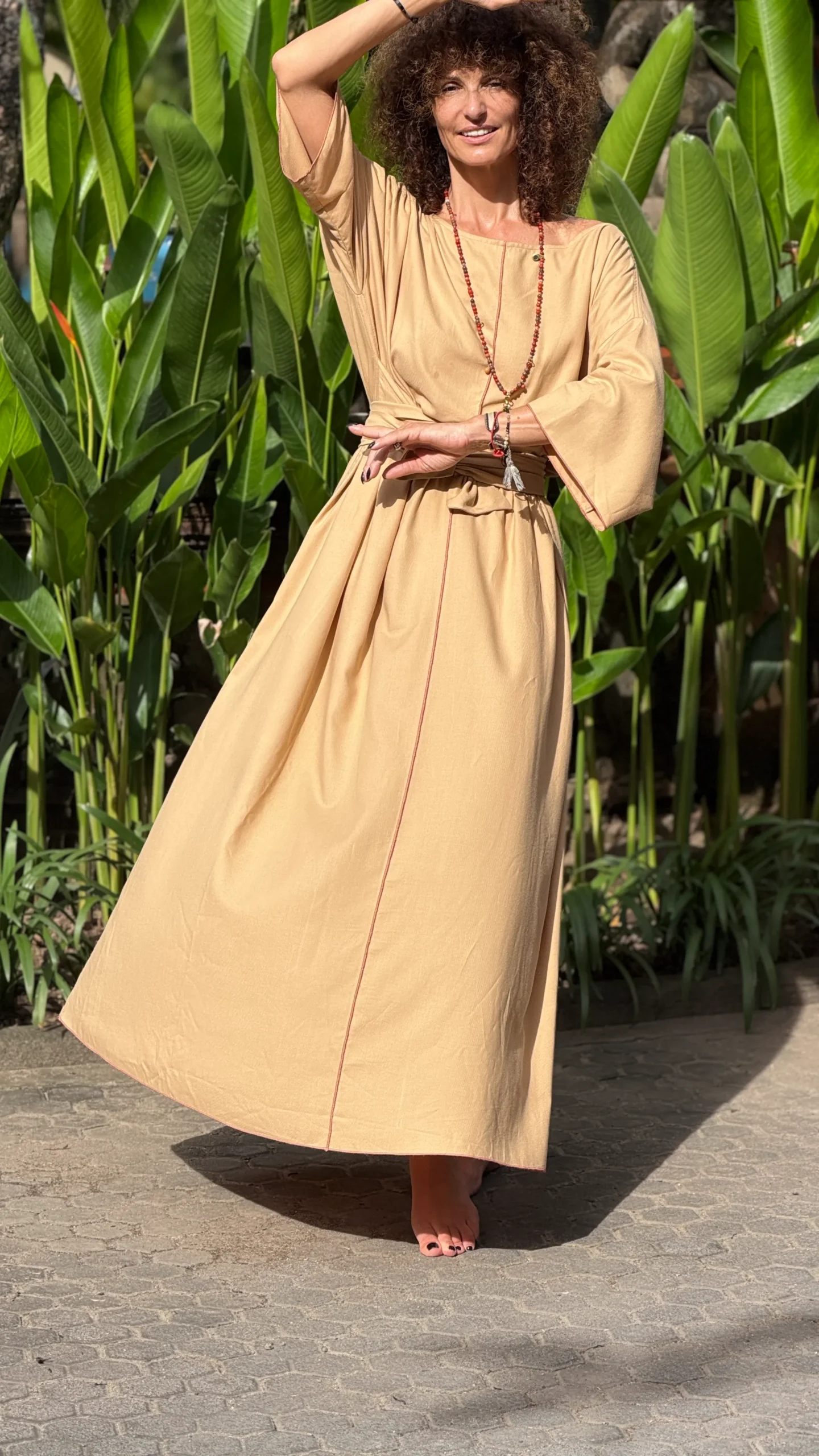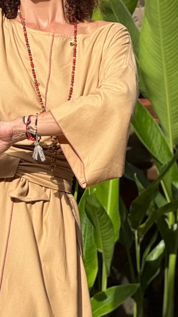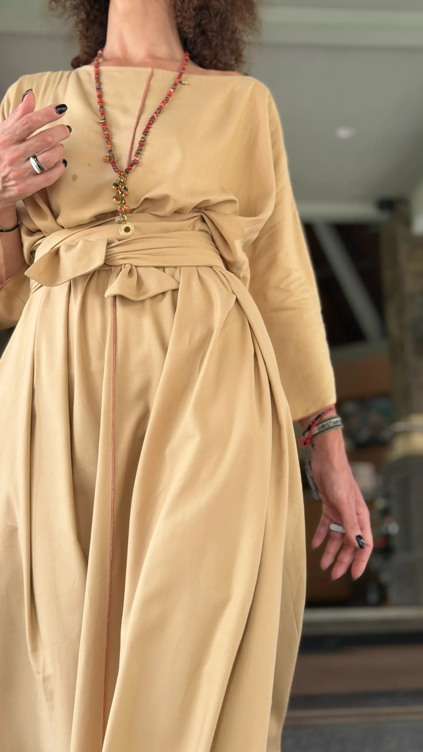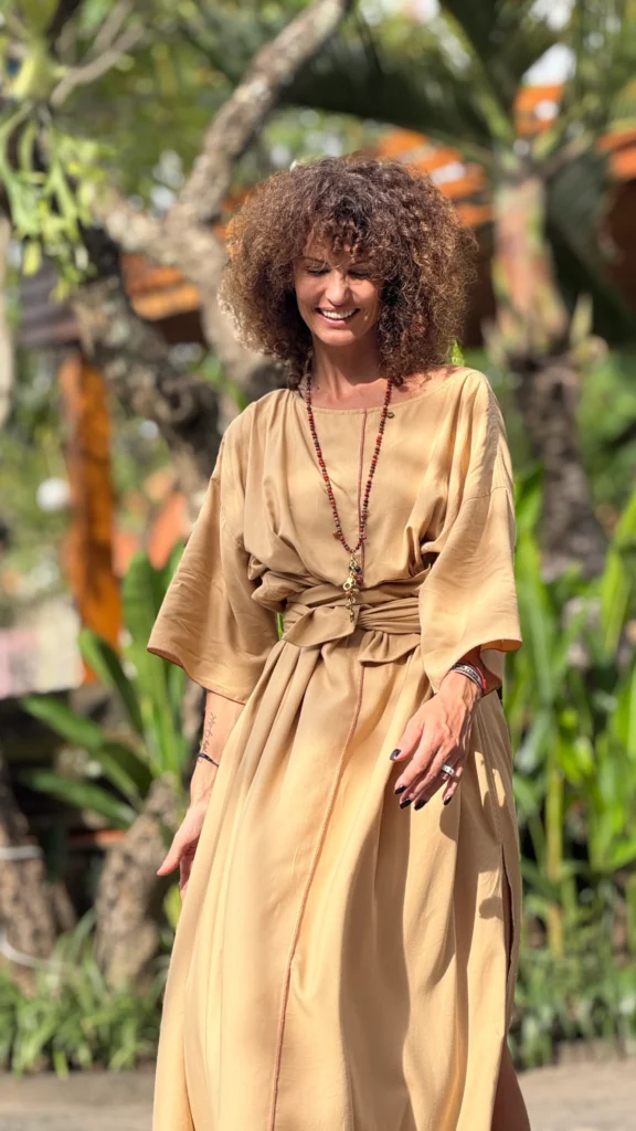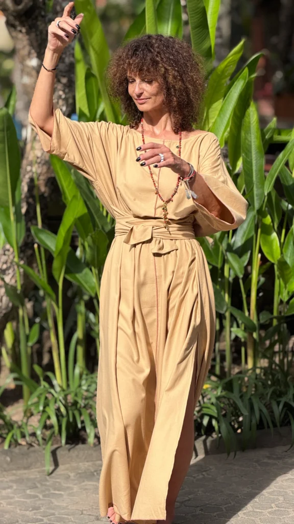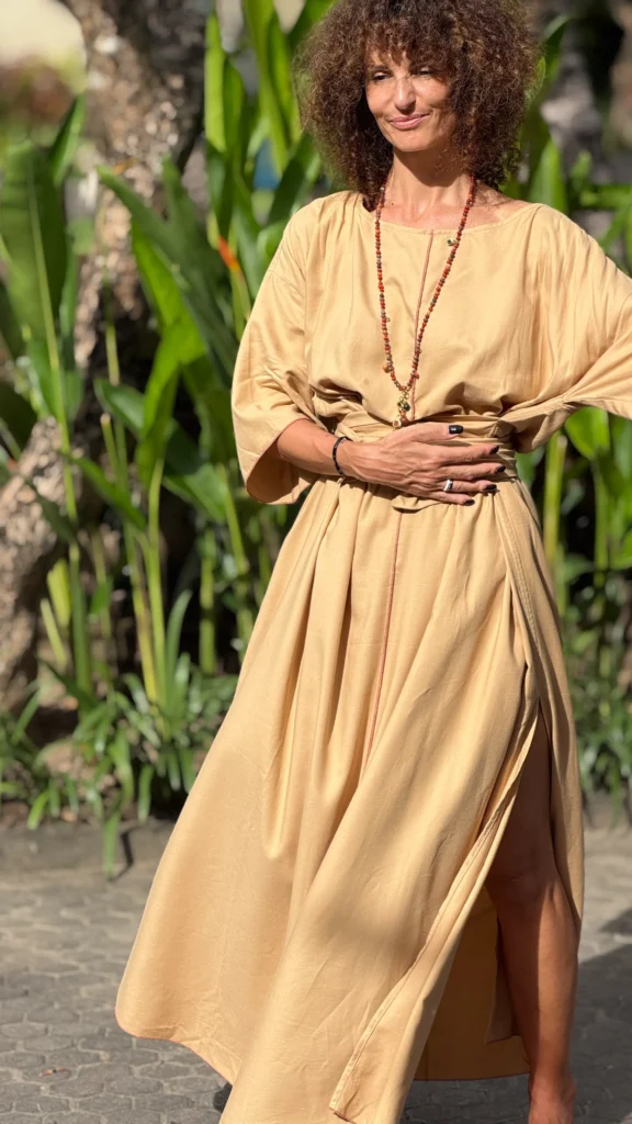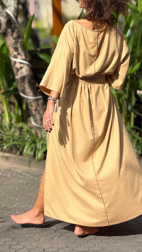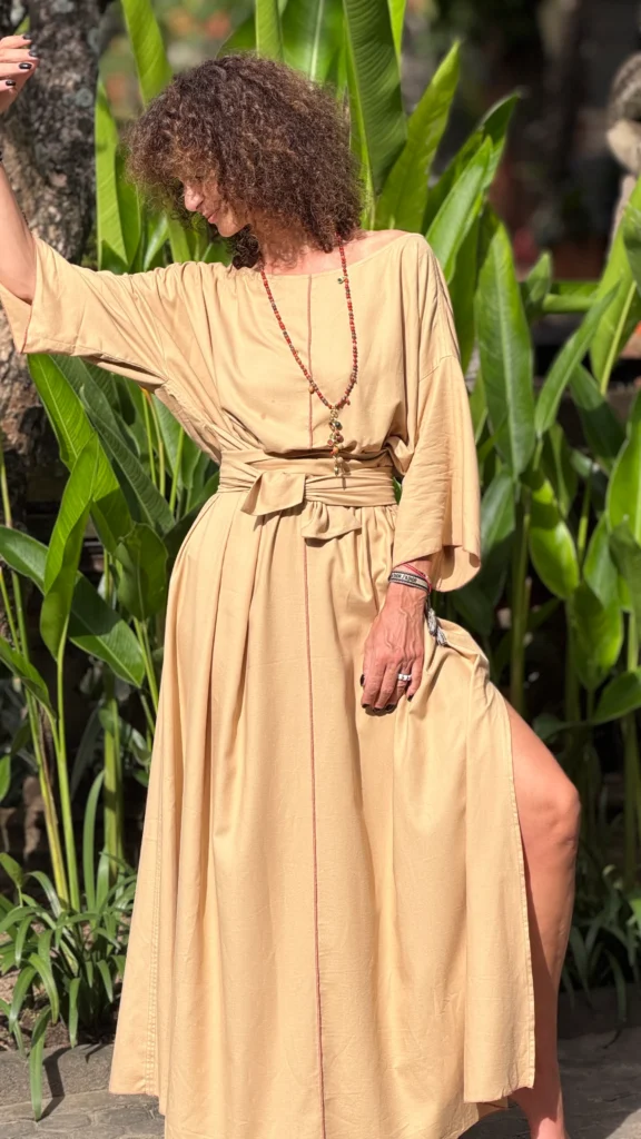 Weites Kleid mit breiten Bändern zum Binden. Der große Ausschnitt bringt Ihren Schmuck besonders gut zur Geltung. Die farbigen Nähte und die Ärmelverzierung unterstreichen seine Zartheit. Hergestellt aus dünnem Baumwoll-Viskose-Gewebe, mit großem Schlitz an der Seite. Die Bänder können vorne und hinten gebunden werden, um die Taille nach Belieben zu betonen.
