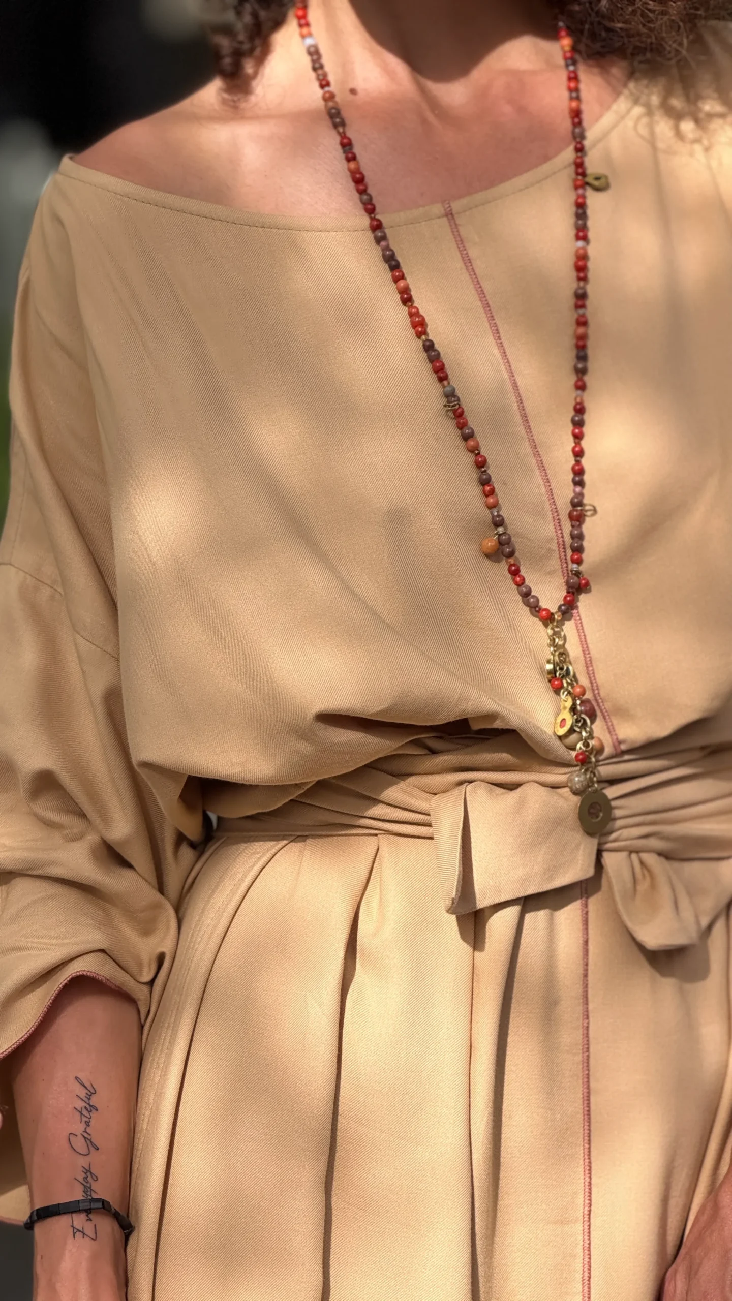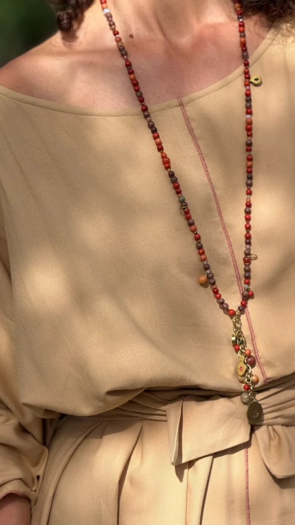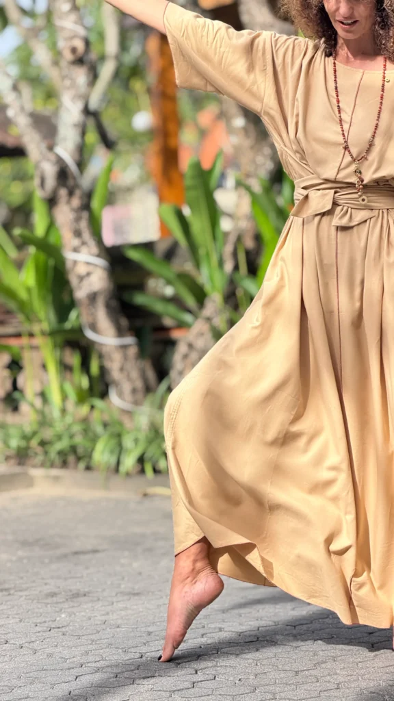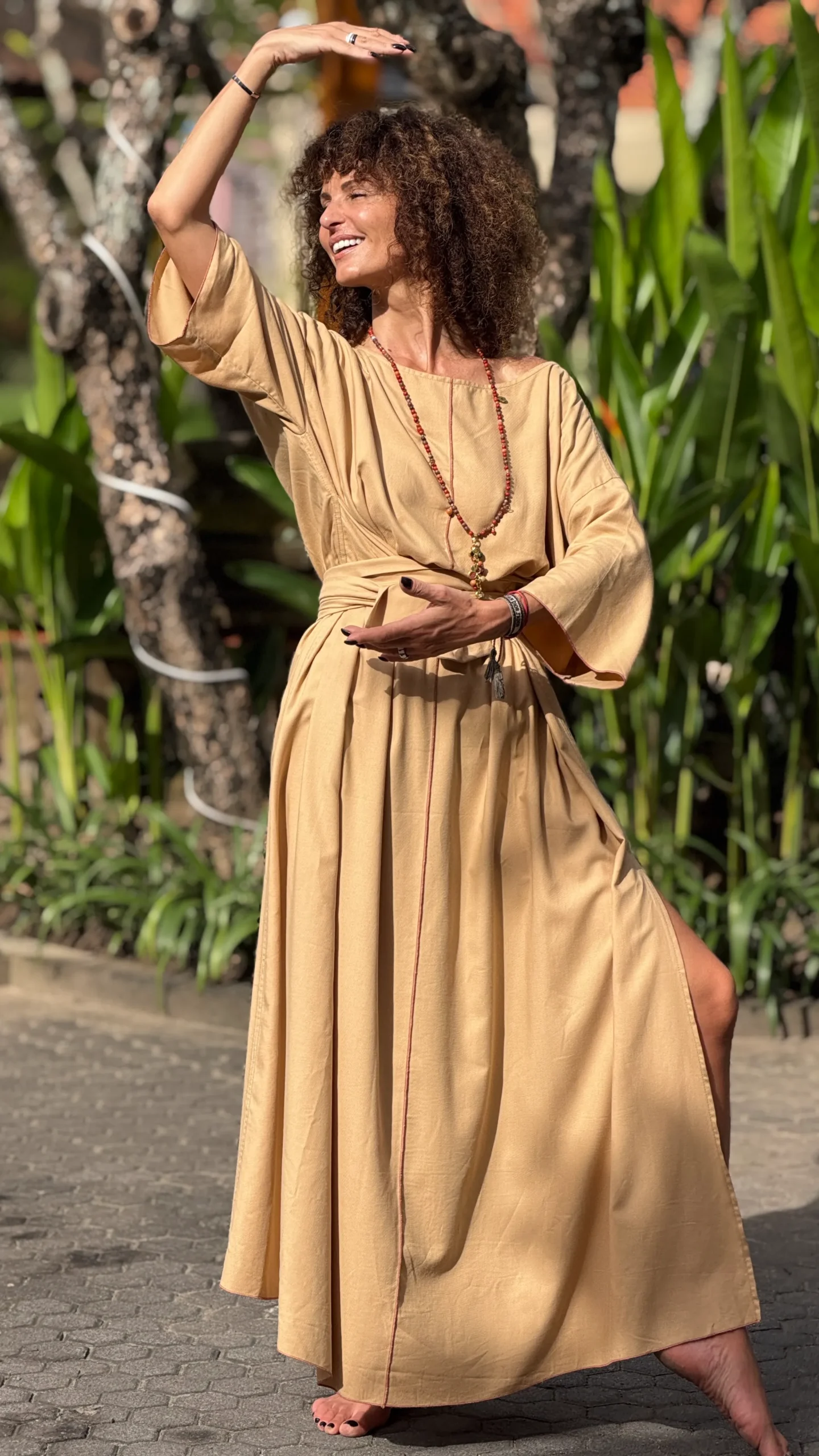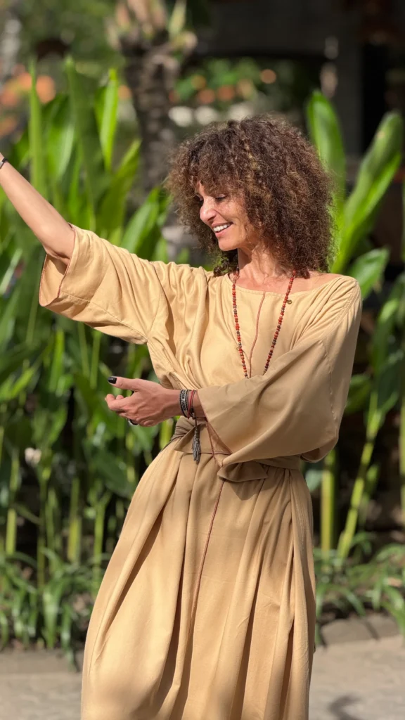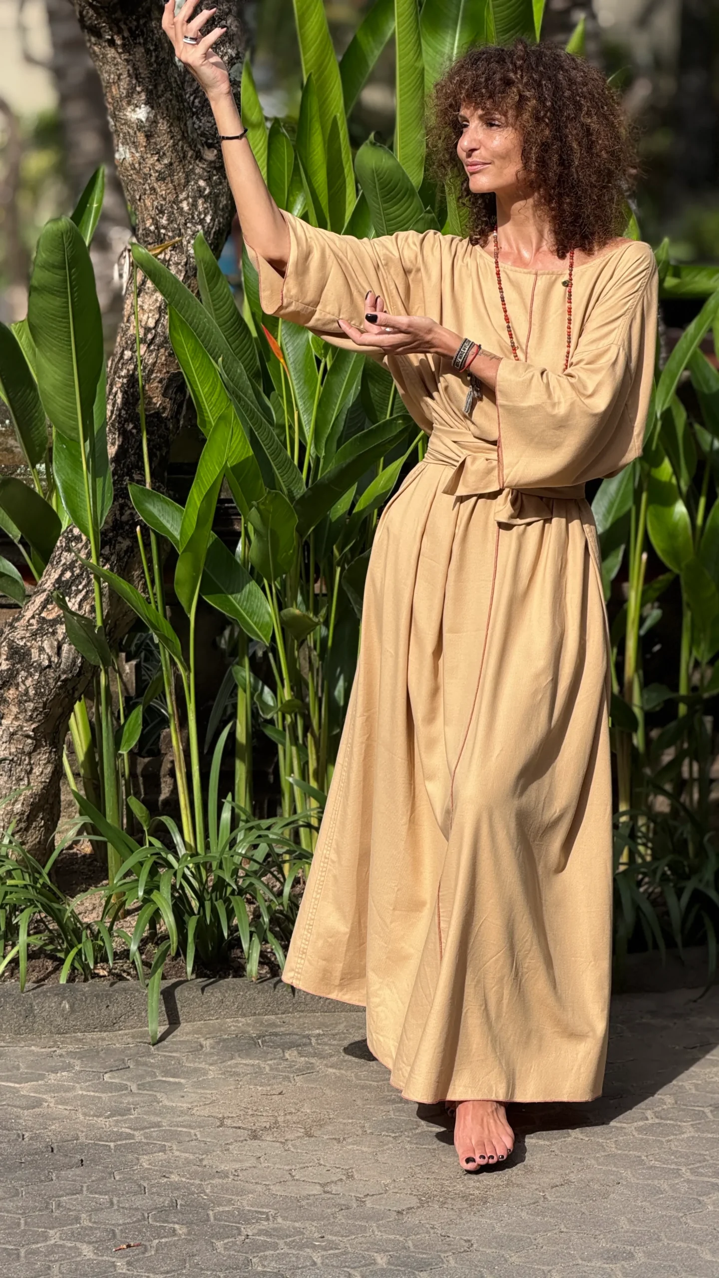 Weites Kleid mit breiten Bändern zum Binden. Der große Ausschnitt bringt Ihren Schmuck besonders gut zur Geltung. Die farbigen Nähte und die Ärmelverzierung unterstreichen seine Zartheit. Hergestellt aus dünnem Baumwoll-Viskose-Gewebe, mit großem Schlitz an der Seite. Die Bänder können vorne und hinten gebunden werden, um die Taille nach Belieben zu betonen.