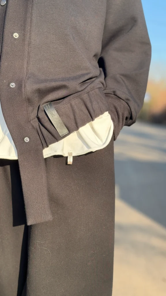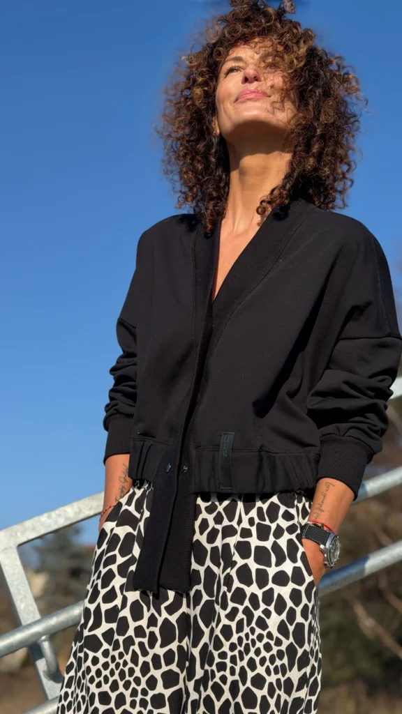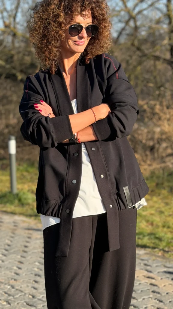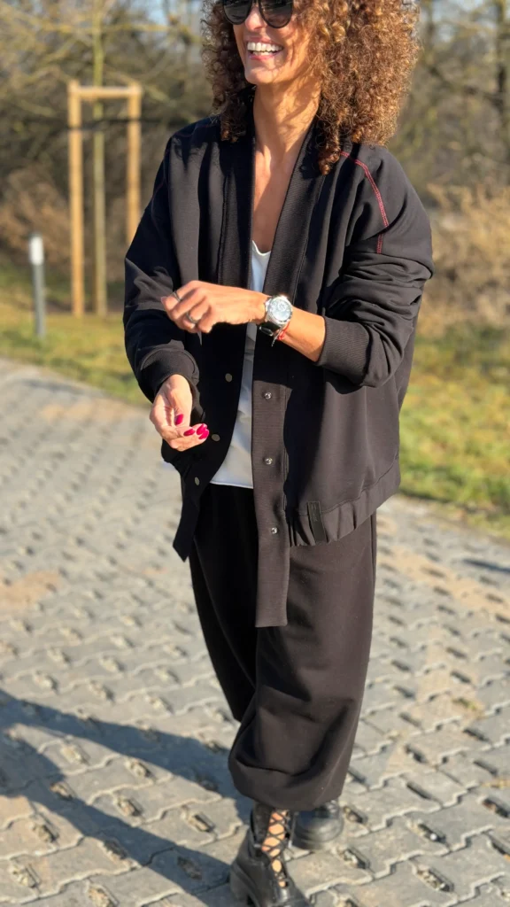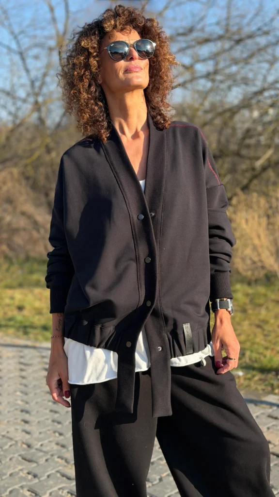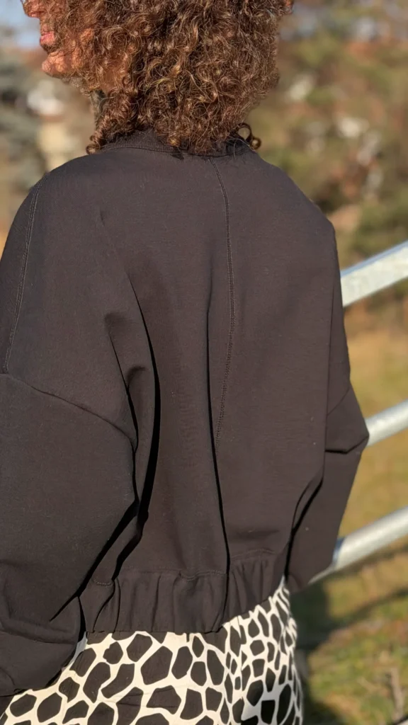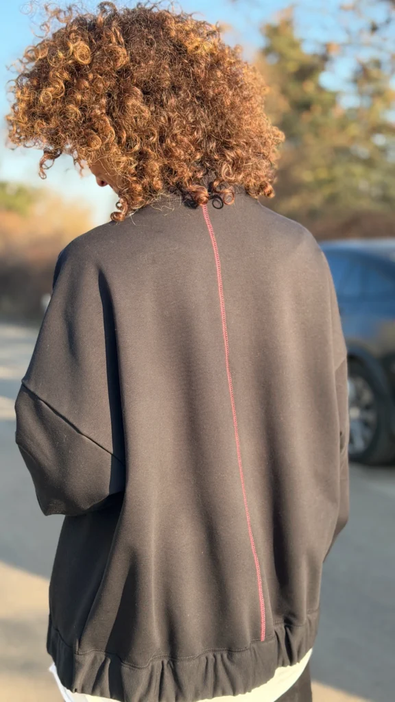 Ungeknöpftes Sweatshirt im College-Stil aus schwarzem Schlingenstrick. Mit Ziernähten an Schultern und Rücken. Der Halsausschnitt ist mit einem verlängerten Element mit Gummizug am unteren Ende versehen (Sie benötigen ein kleineres oder größeres Element - bitte geben Sie dies in den Kommentaren zu Ihrer Bestellung an). Wählen Sie die von Ihnen bevorzugte Version - kürzer oder länger, farbig oder mit Kontrastnähten. Wir haben es mit einer Ballonhose und einer leichten Viskosehose kombiniert, was werden Sie dazu tragen?