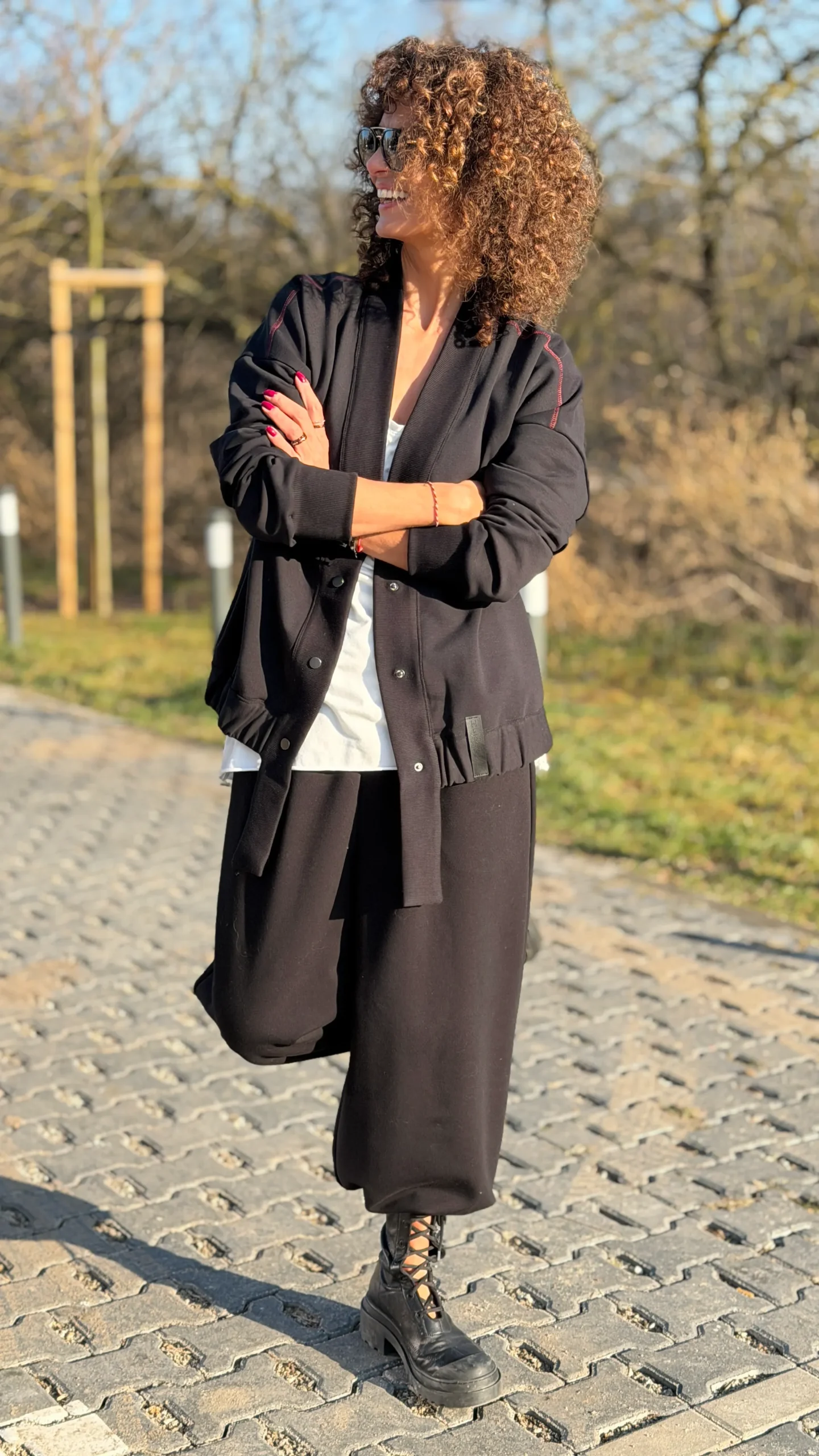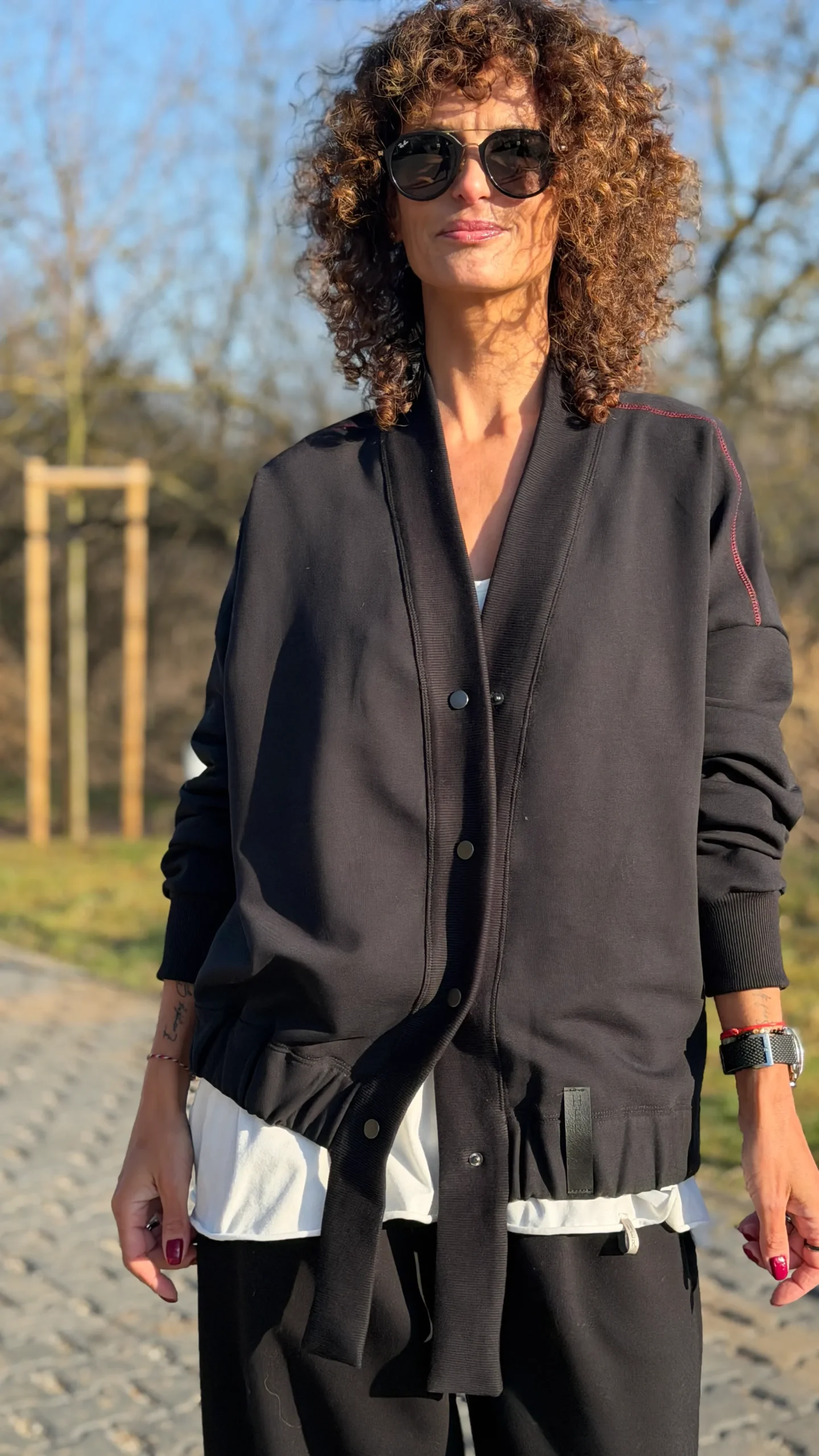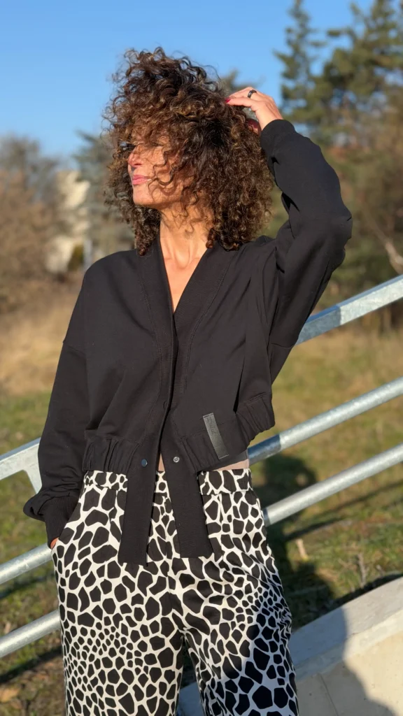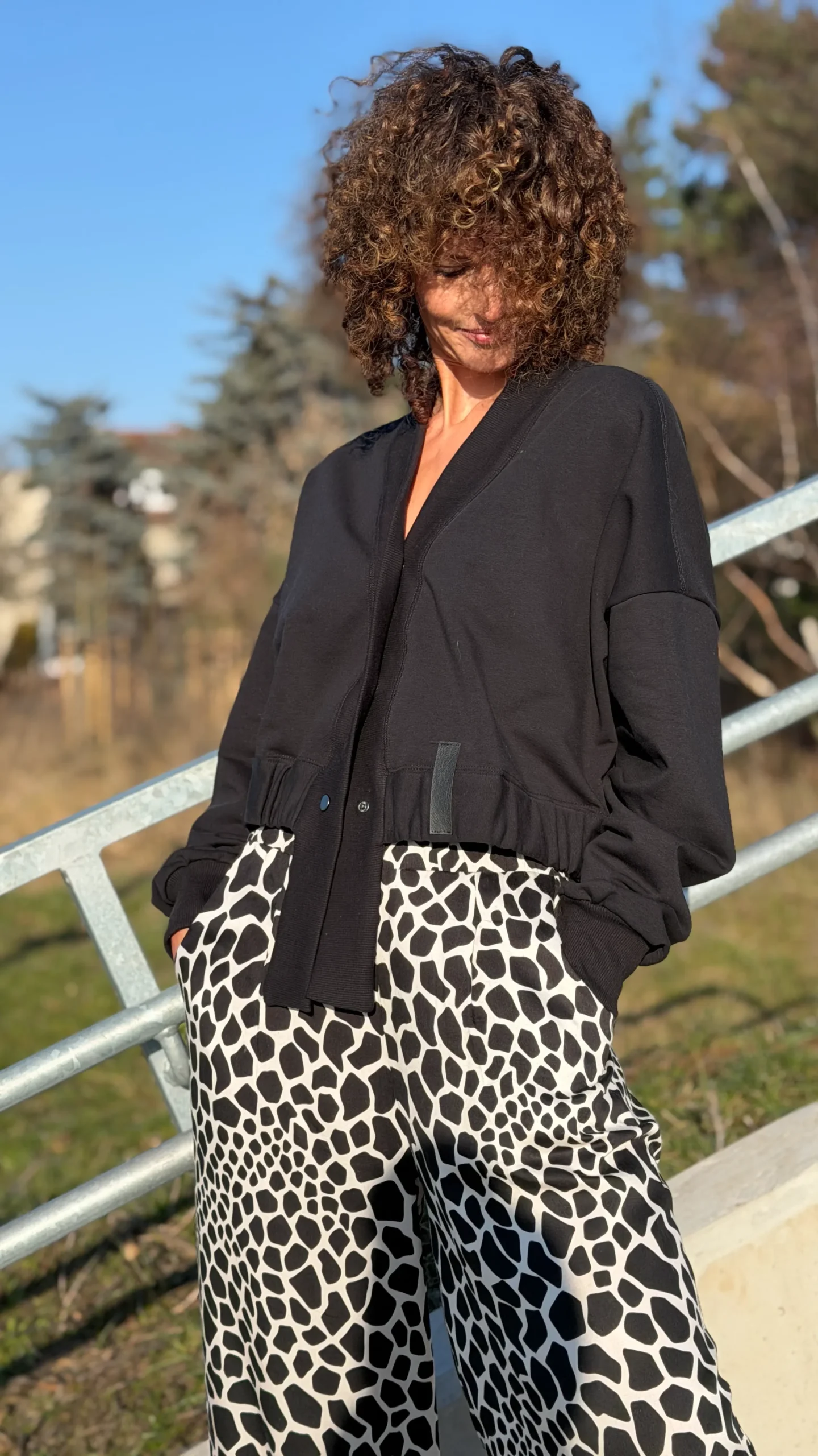 Ungeknöpftes Sweatshirt im College-Stil aus schwarzem Schlingenstrick. Mit Ziernähten an Schultern und Rücken. Der Halsausschnitt ist mit einem verlängerten Element mit Gummizug am unteren Ende versehen (Sie benötigen ein kleineres oder größeres Element - bitte geben Sie dies in den Kommentaren zu Ihrer Bestellung an). Wählen Sie die von Ihnen bevorzugte Version - kürzer oder länger, farbig oder mit Kontrastnähten. Wir haben es mit einer Ballonhose und einer leichten Viskosehose kombiniert, was werden Sie dazu tragen?