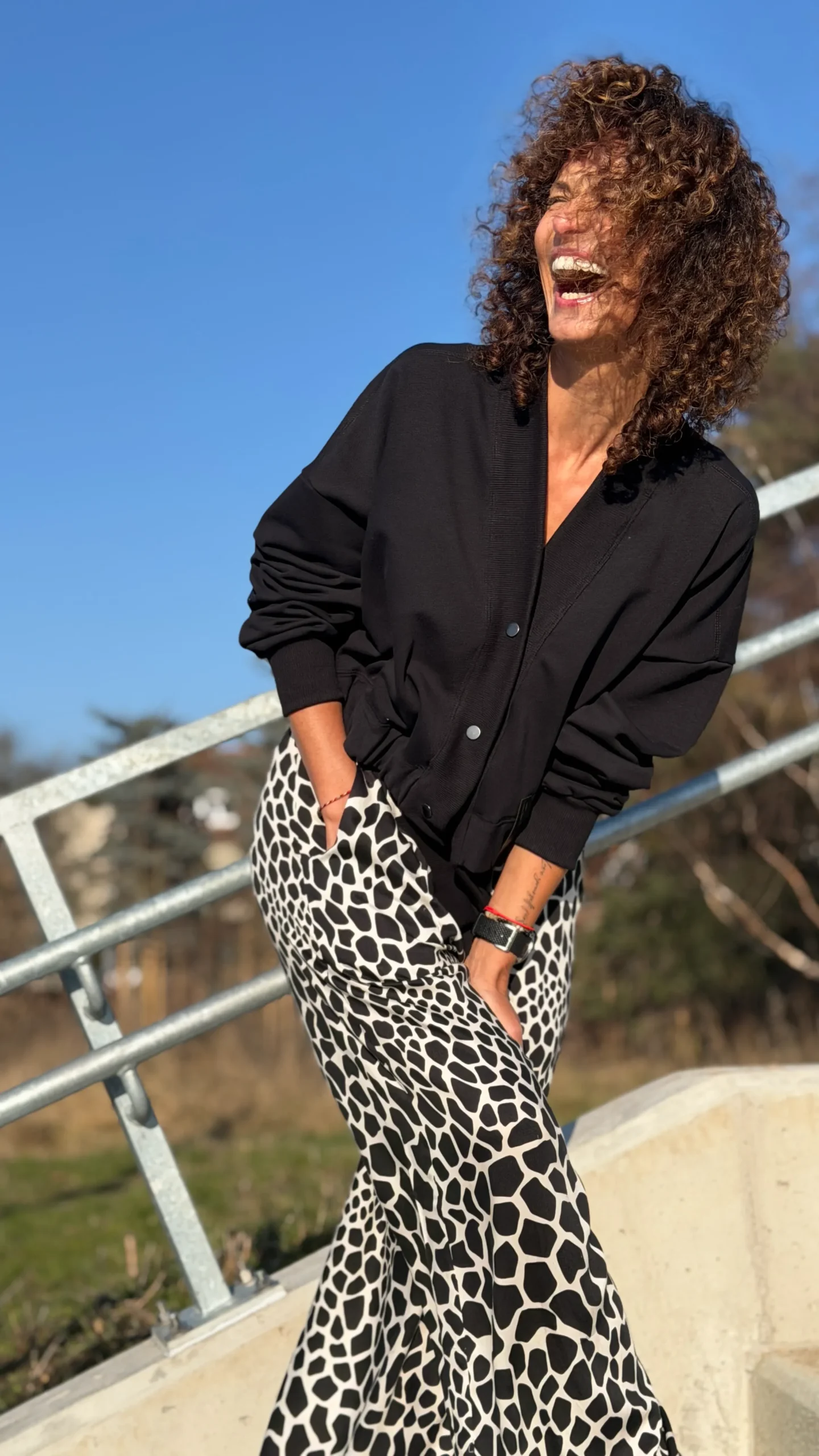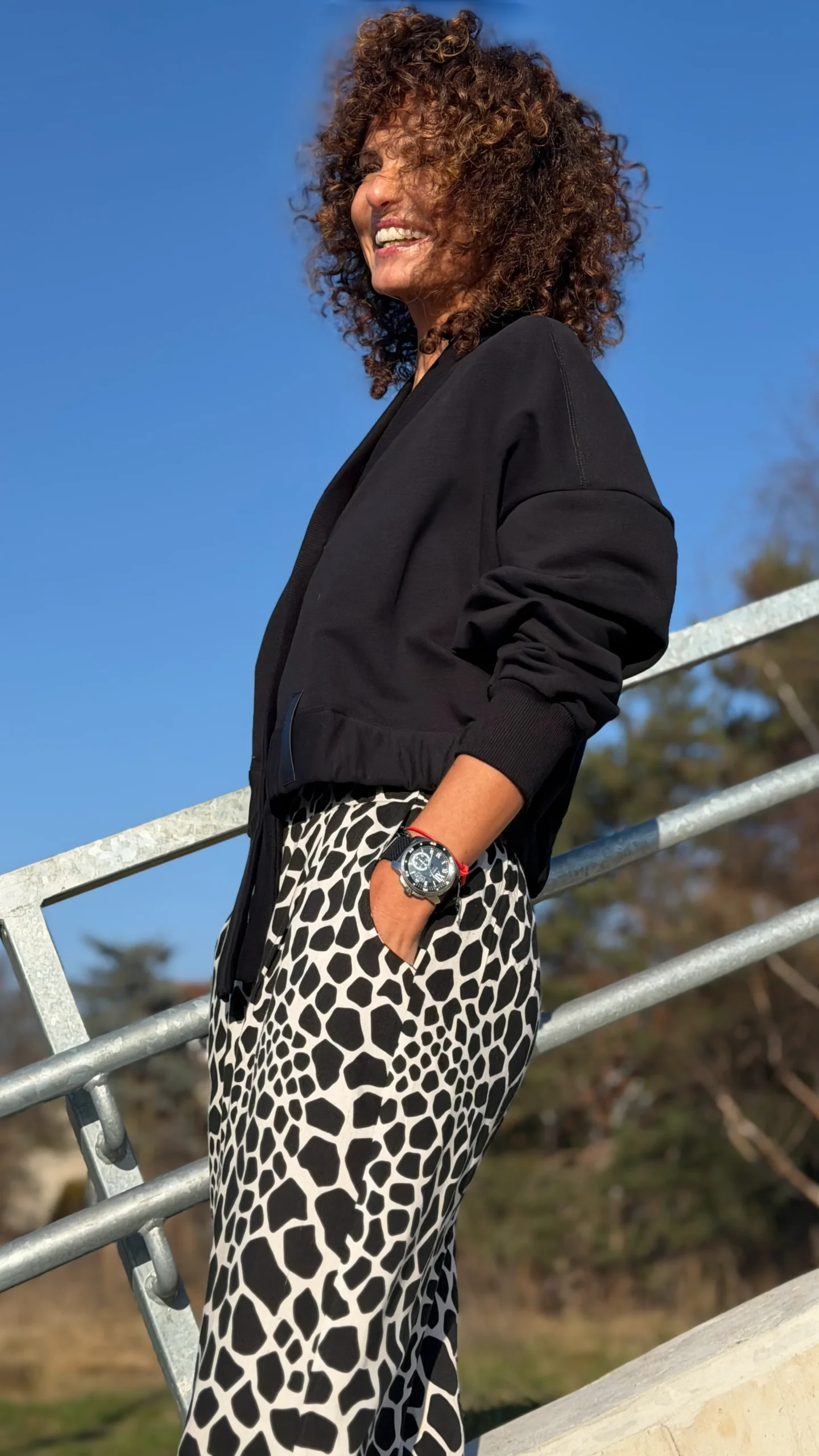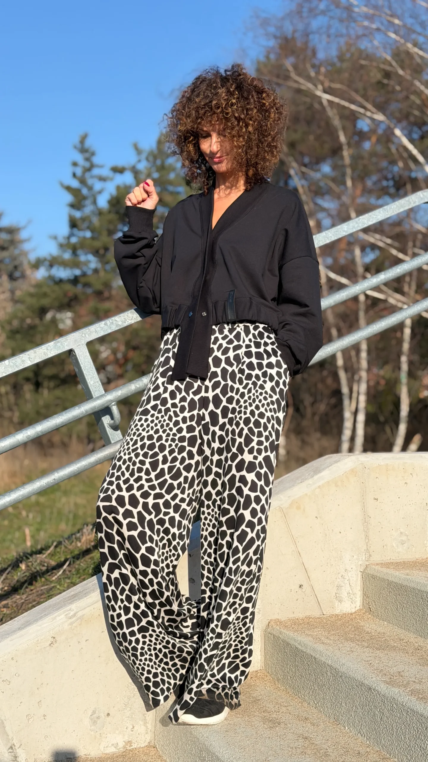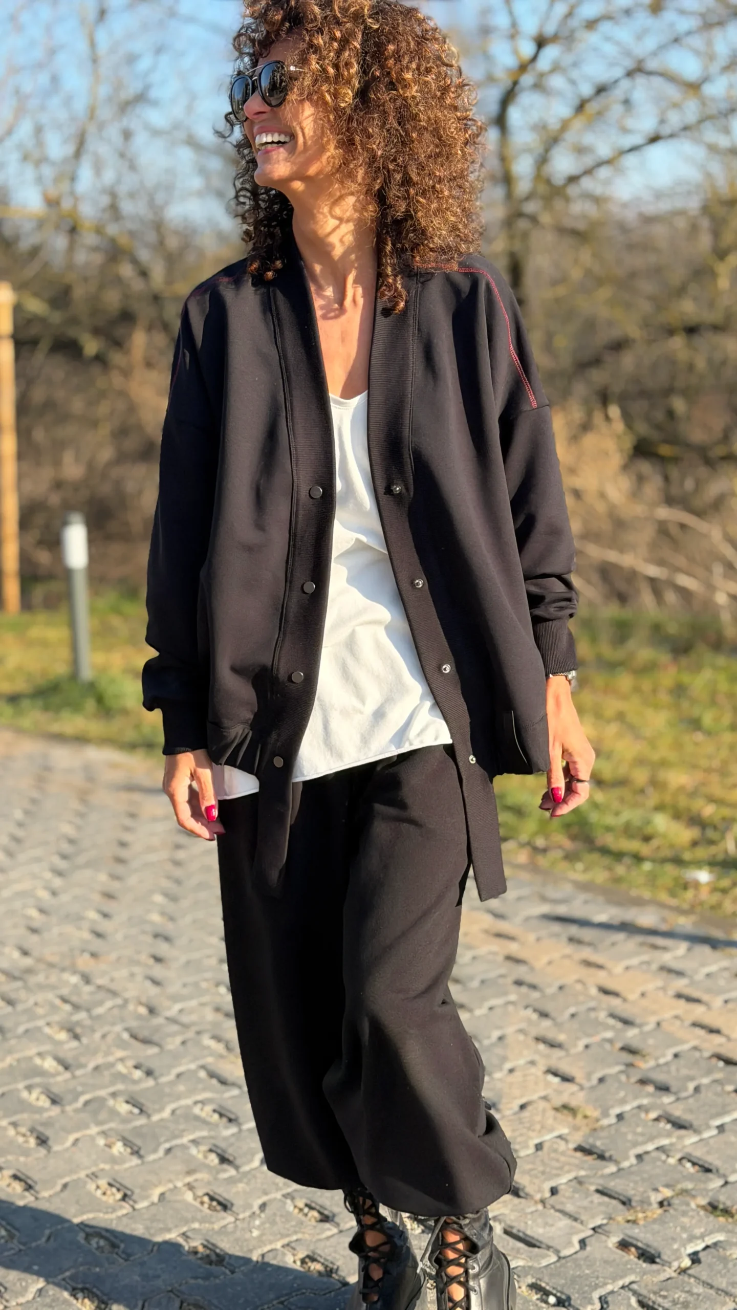 Ungeknöpftes Sweatshirt im College-Stil aus schwarzem Schlingenstrick. Mit Ziernähten an Schultern und Rücken. Der Halsausschnitt ist mit einem verlängerten Element mit Gummizug am unteren Ende versehen (Sie benötigen ein kleineres oder größeres Element - bitte geben Sie dies in den Kommentaren zu Ihrer Bestellung an). Wählen Sie die von Ihnen bevorzugte Version - kürzer oder länger, farbig oder mit Kontrastnähten. Wir haben es mit einer Ballonhose und einer leichten Viskosehose kombiniert, was werden Sie dazu tragen?