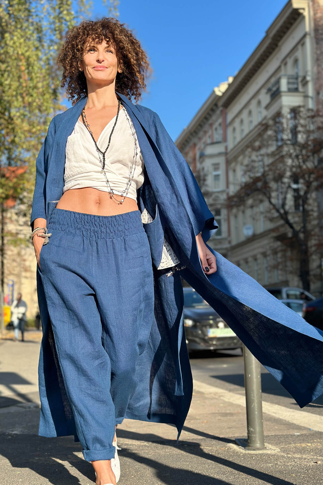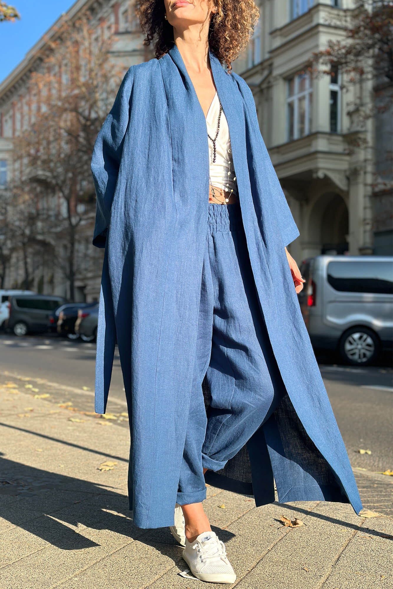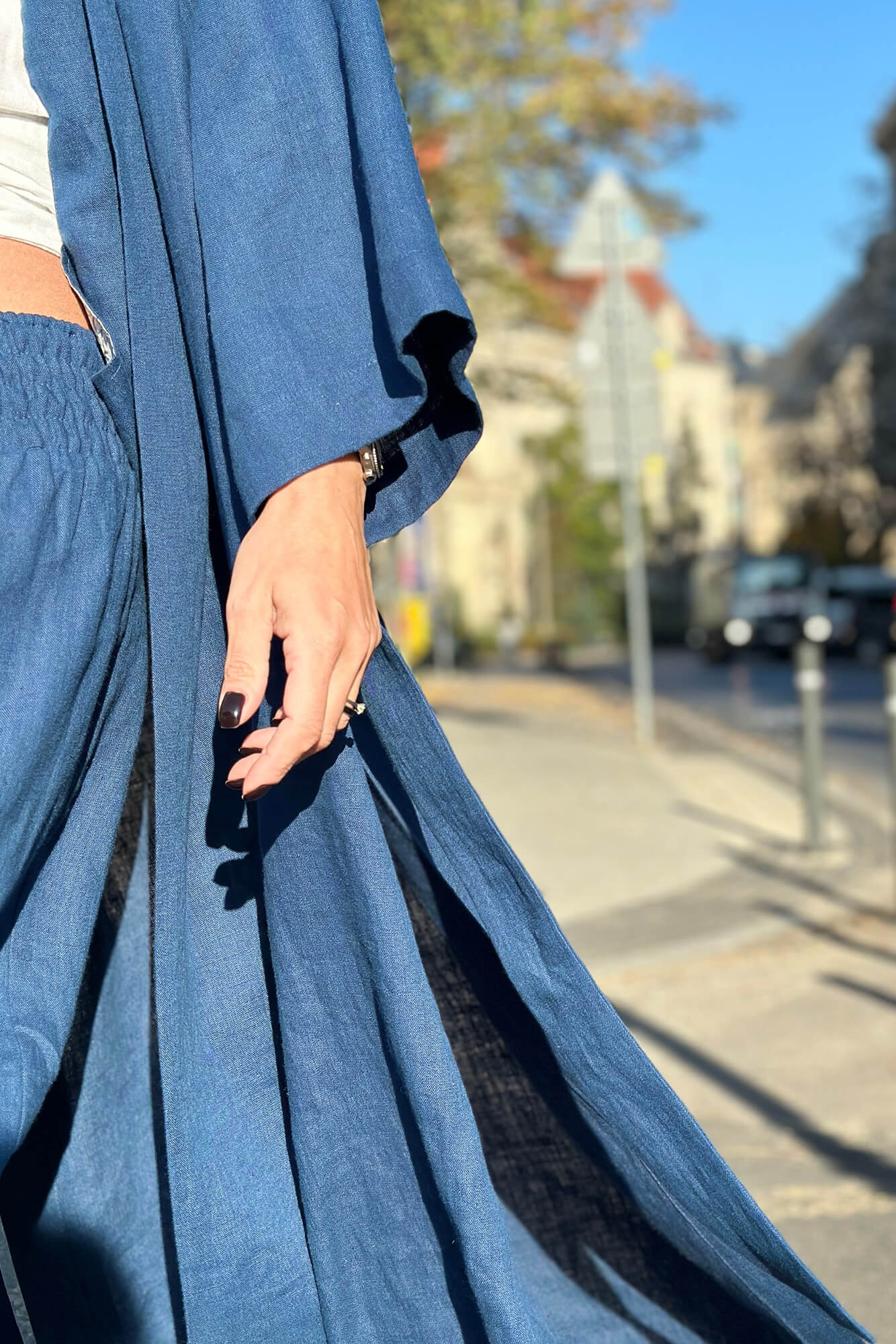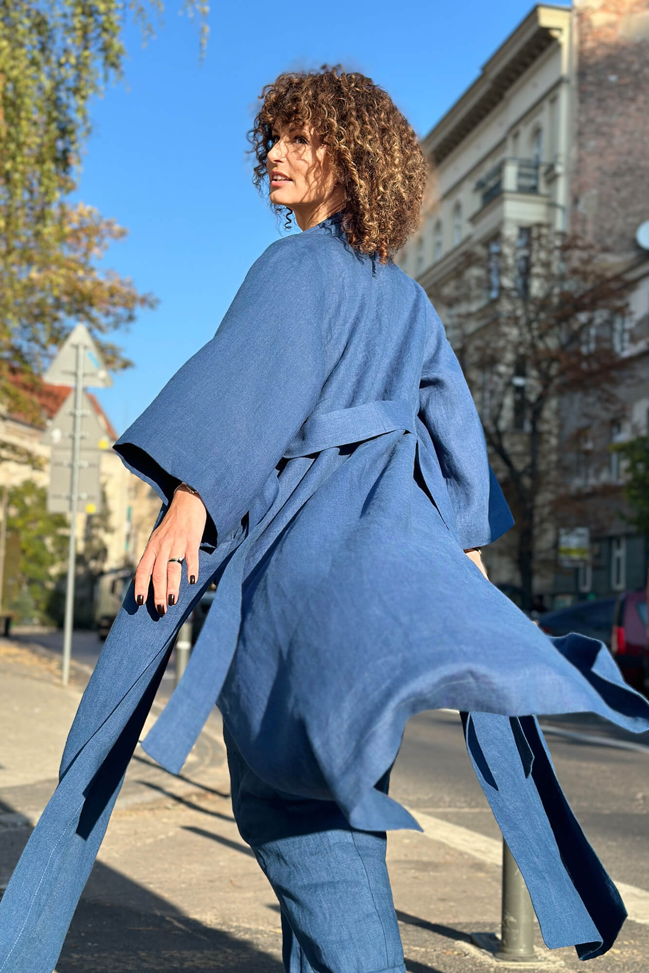 A timeless kimono that will turn heads wherever you go. The kimono has large slits on the sides, a tie belt at the waist and a beautiful shawl neckline. Large pockets on the sides are finished in a colour of your choice. Short sleeves beautifully accentuate the silhouette. Lined inside in the colour of the pockets.