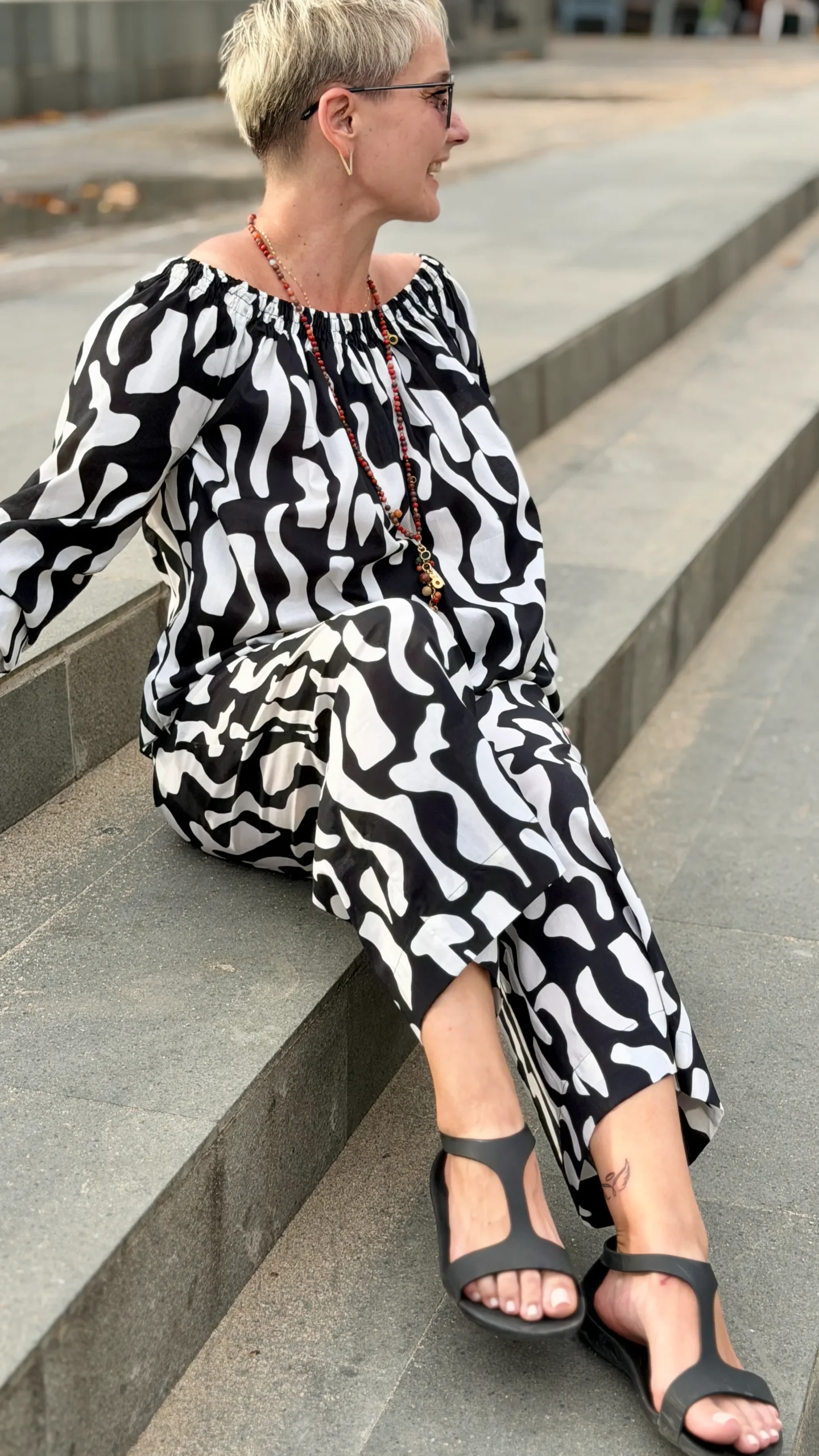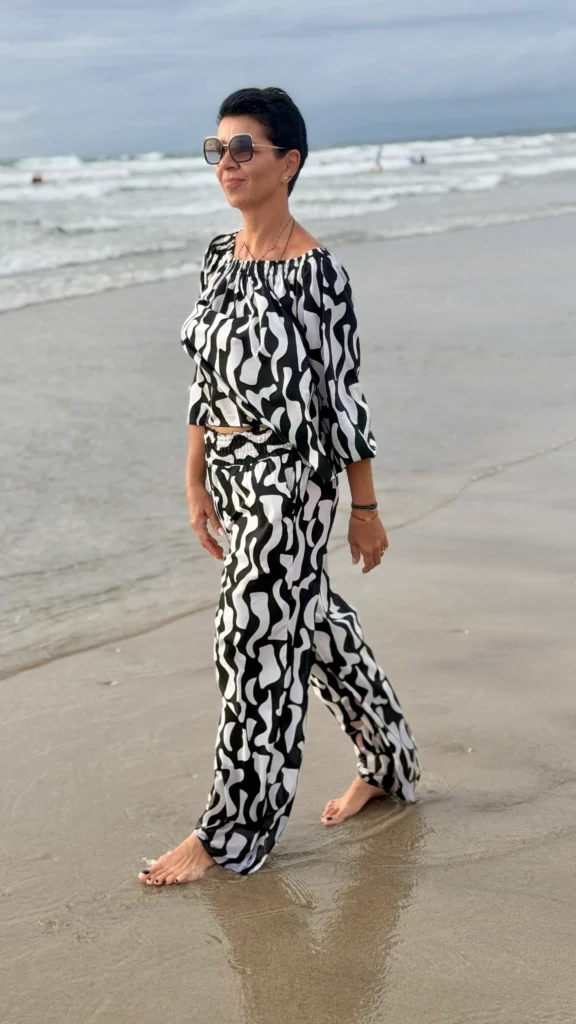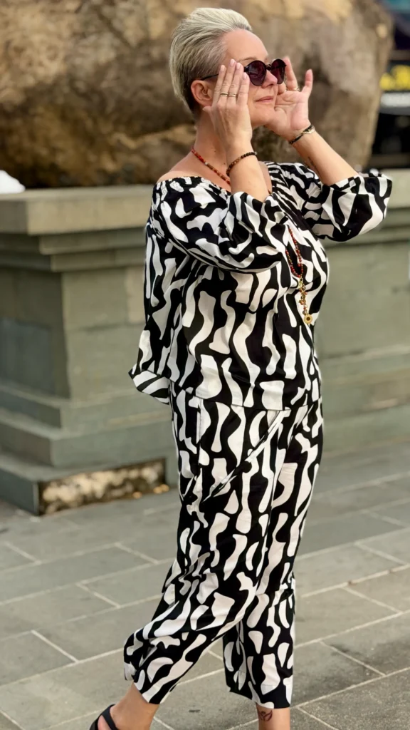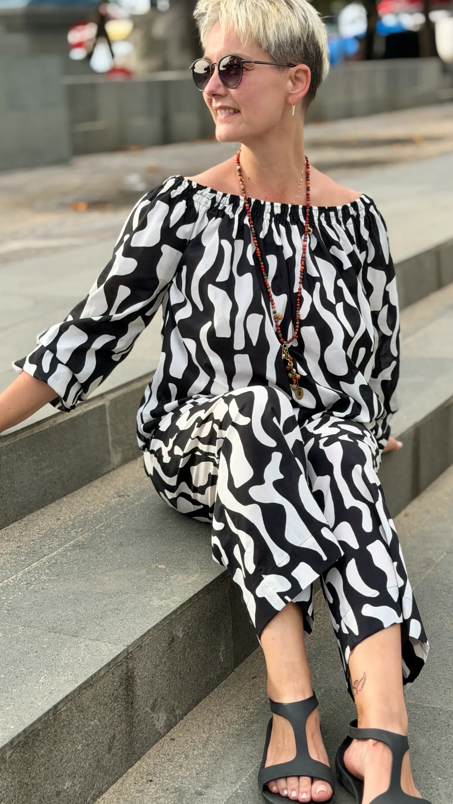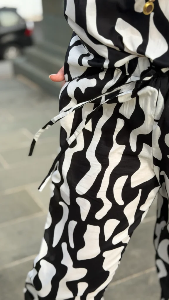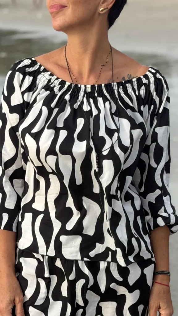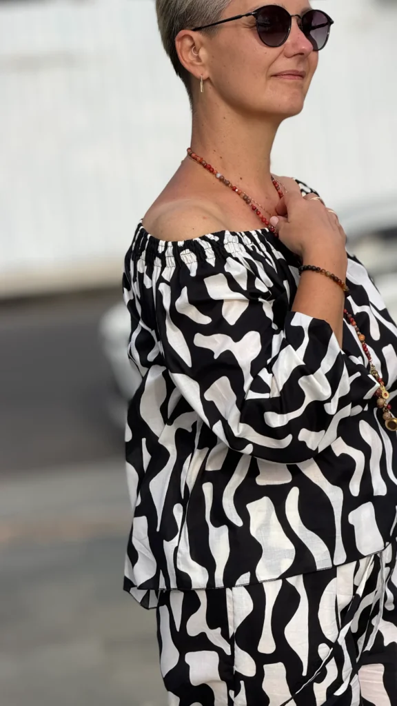 Your favourite colour combination is a classic - black and vanilla? Here you have a ready-made solution. The set includes an oversized blouse and trousers in two cuts to choose from - long trousers or 7/8 trousers. Match the length of the trousers and top to your height and enjoy the lightness of the batiste on warm days.