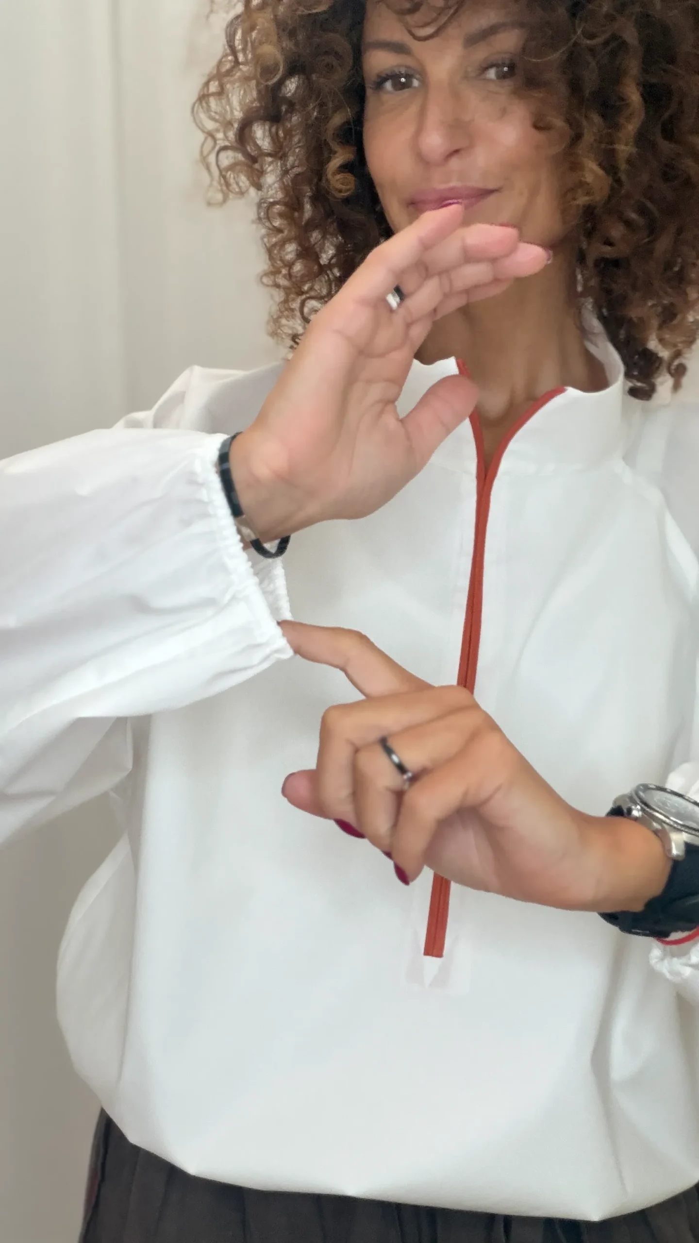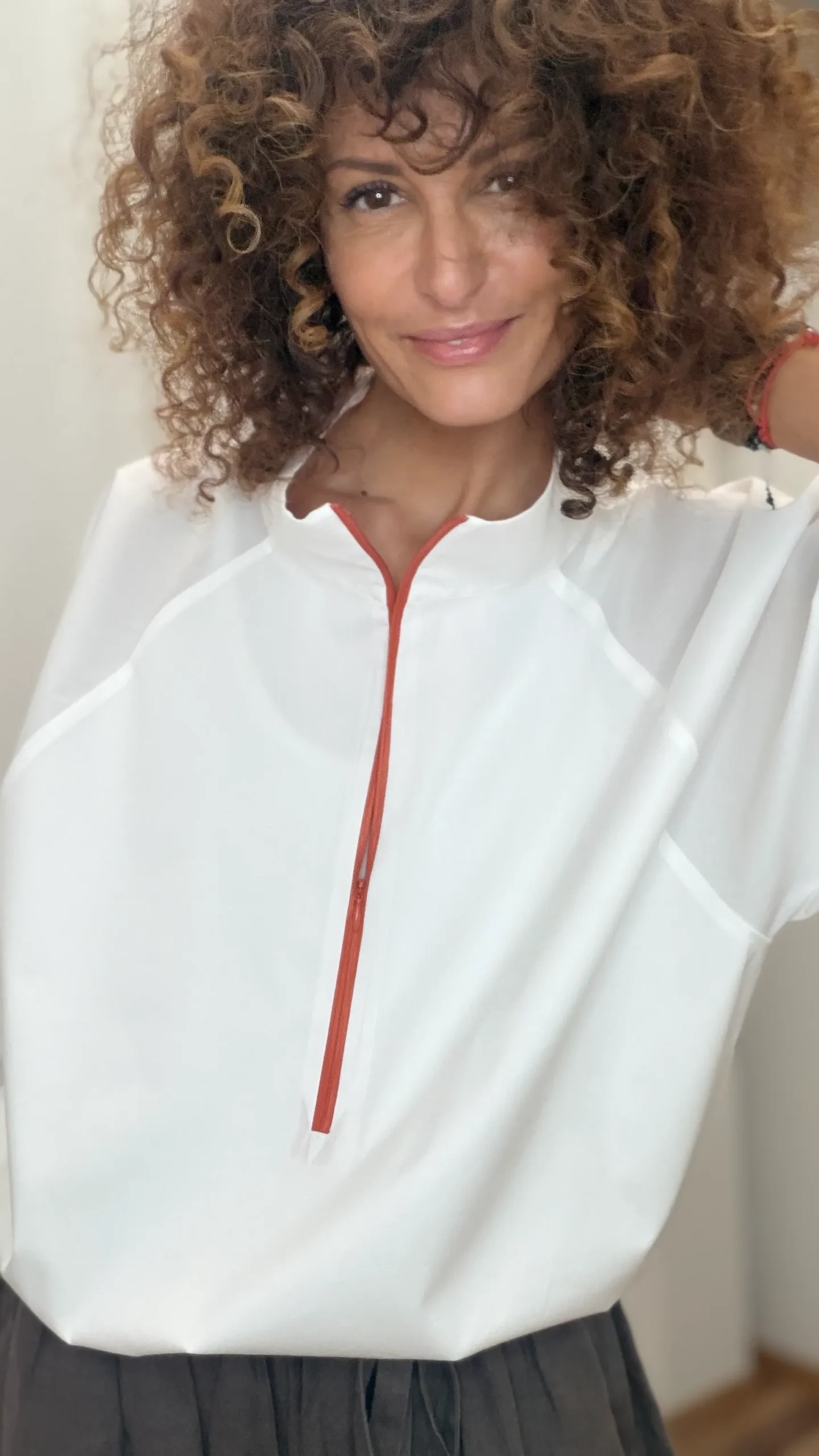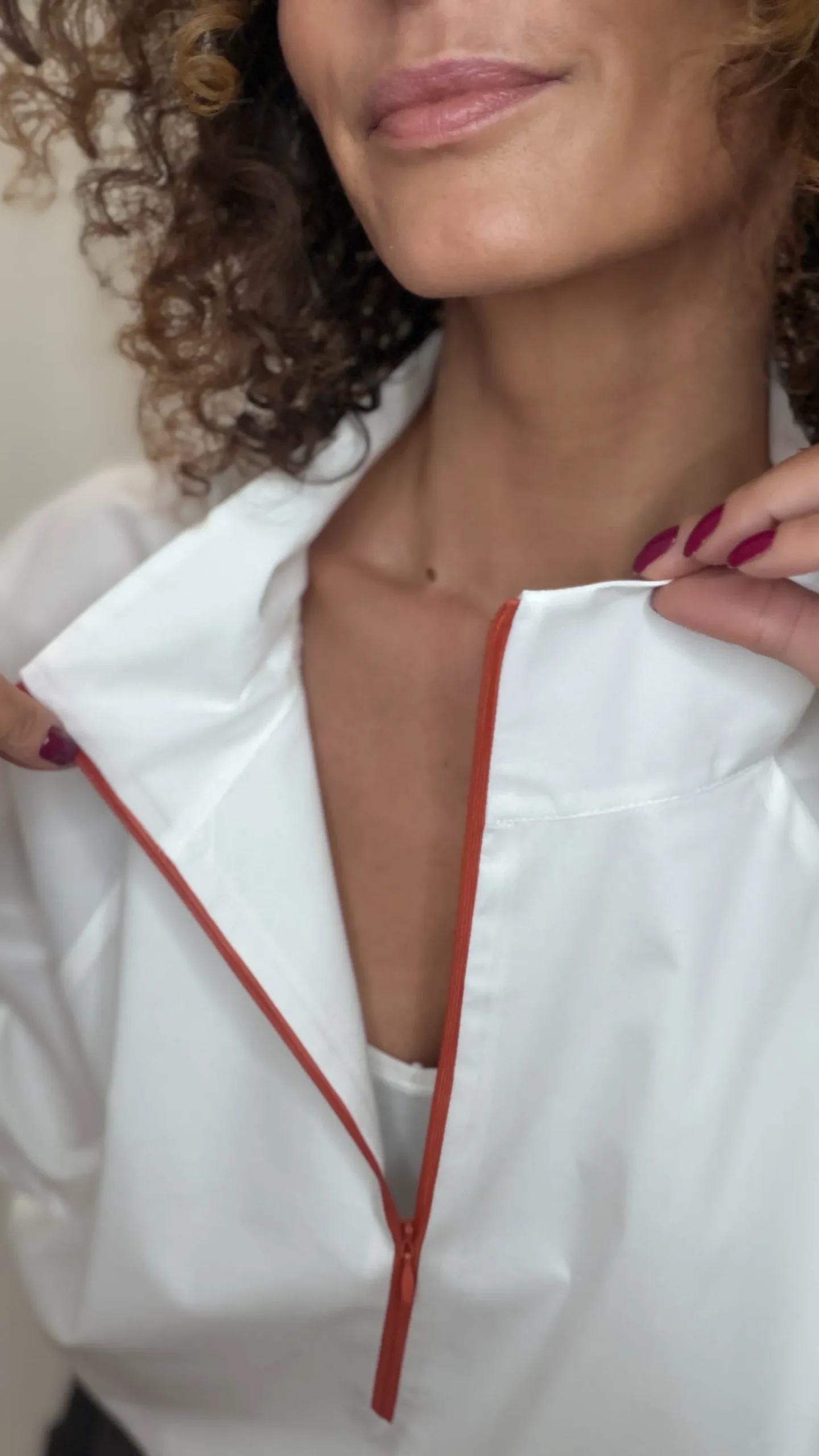 Zipped collar shirt in orange. Elasticated cuffs and hem.