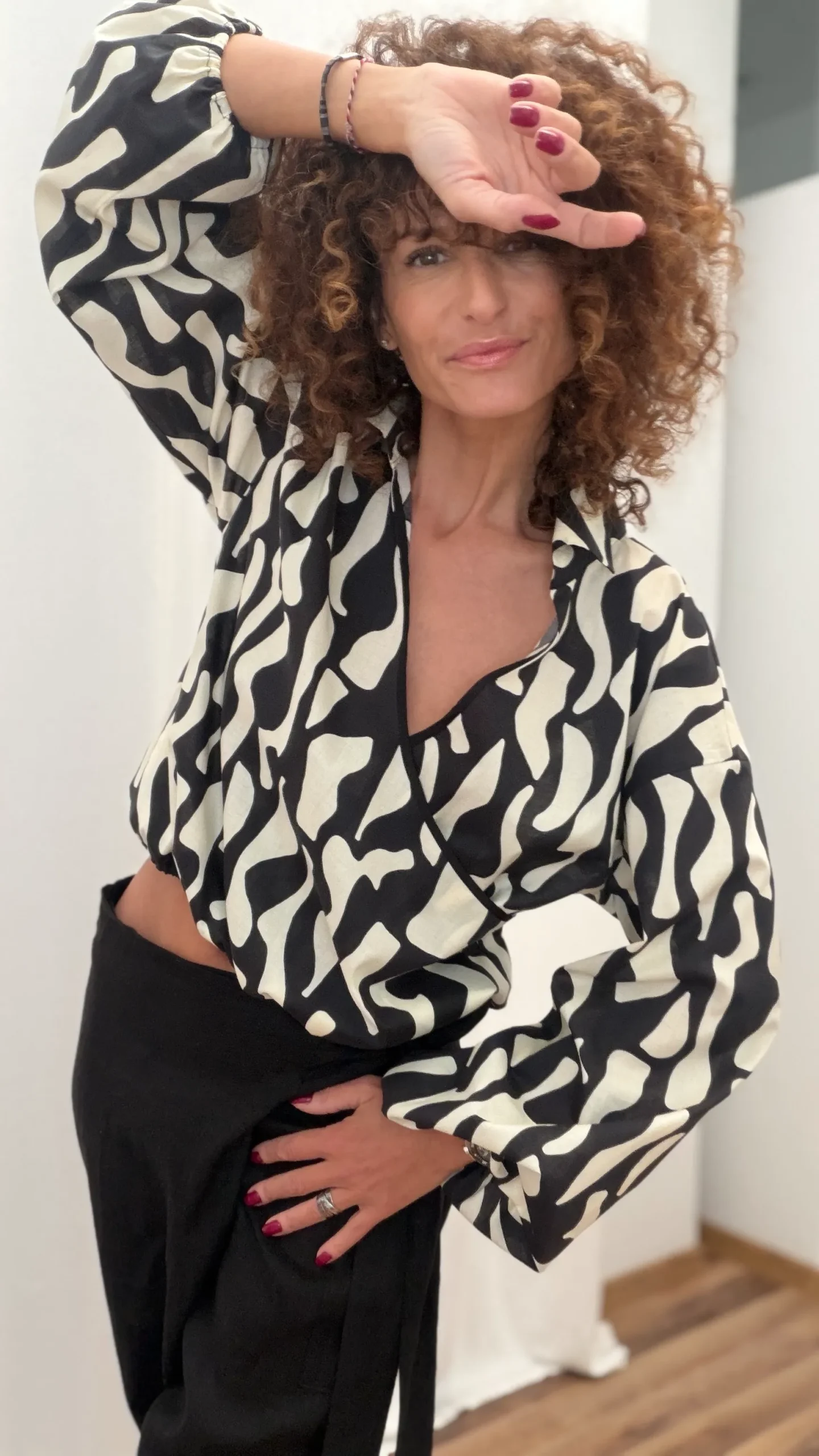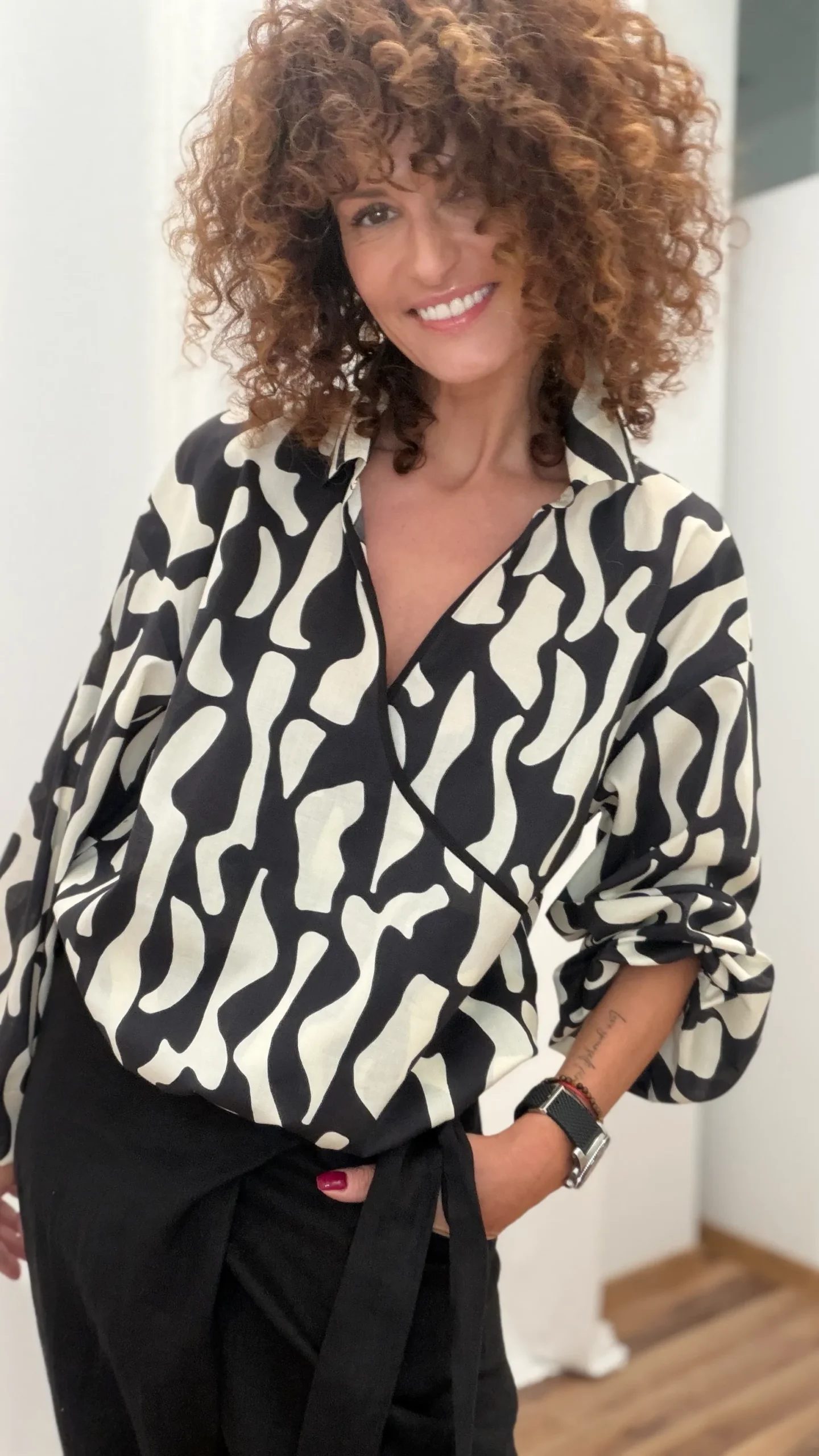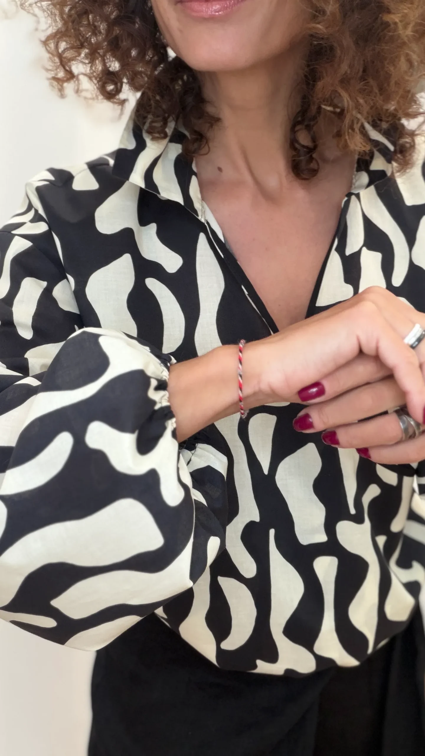 Koszula z kopertowym przodem i bufiastym rękawem. Rękaw i dół koszuli elastyczne, wykończenia w kolorze czarnym.